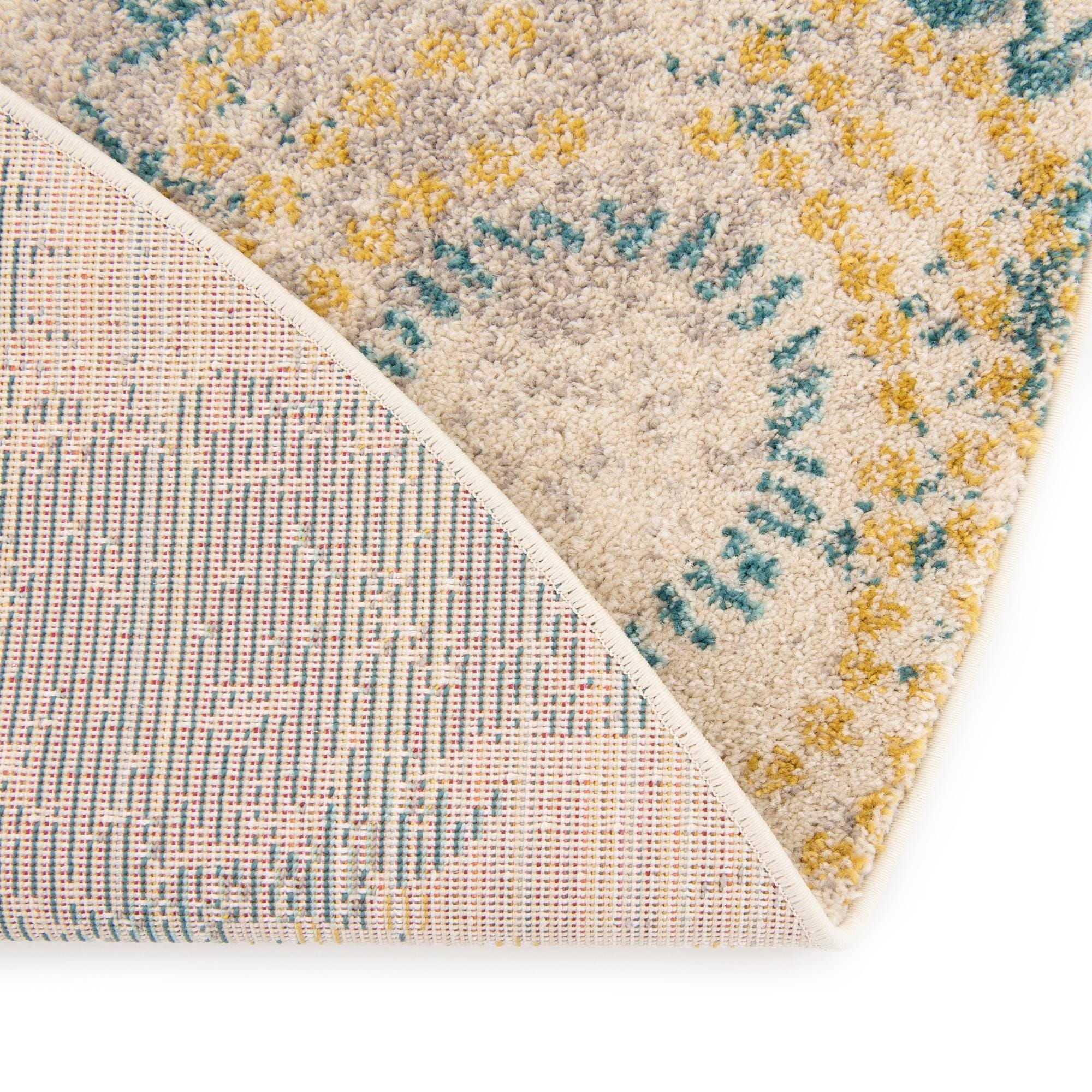 Machine-made from 100% polypropylene, the rug has a low, dense pile that feels soft and even underfoot while holding a defined printed pattern. The round shape works well beneath a round dining or breakfast table, as an anchor for a small seating grouping, or layered in a casual living room or sunroom. Pair it with light wood furniture, woven textures and navy or teal accents for a coastal or eclectic vibe, or let it add color to a neutral modern space or a relaxed family room.