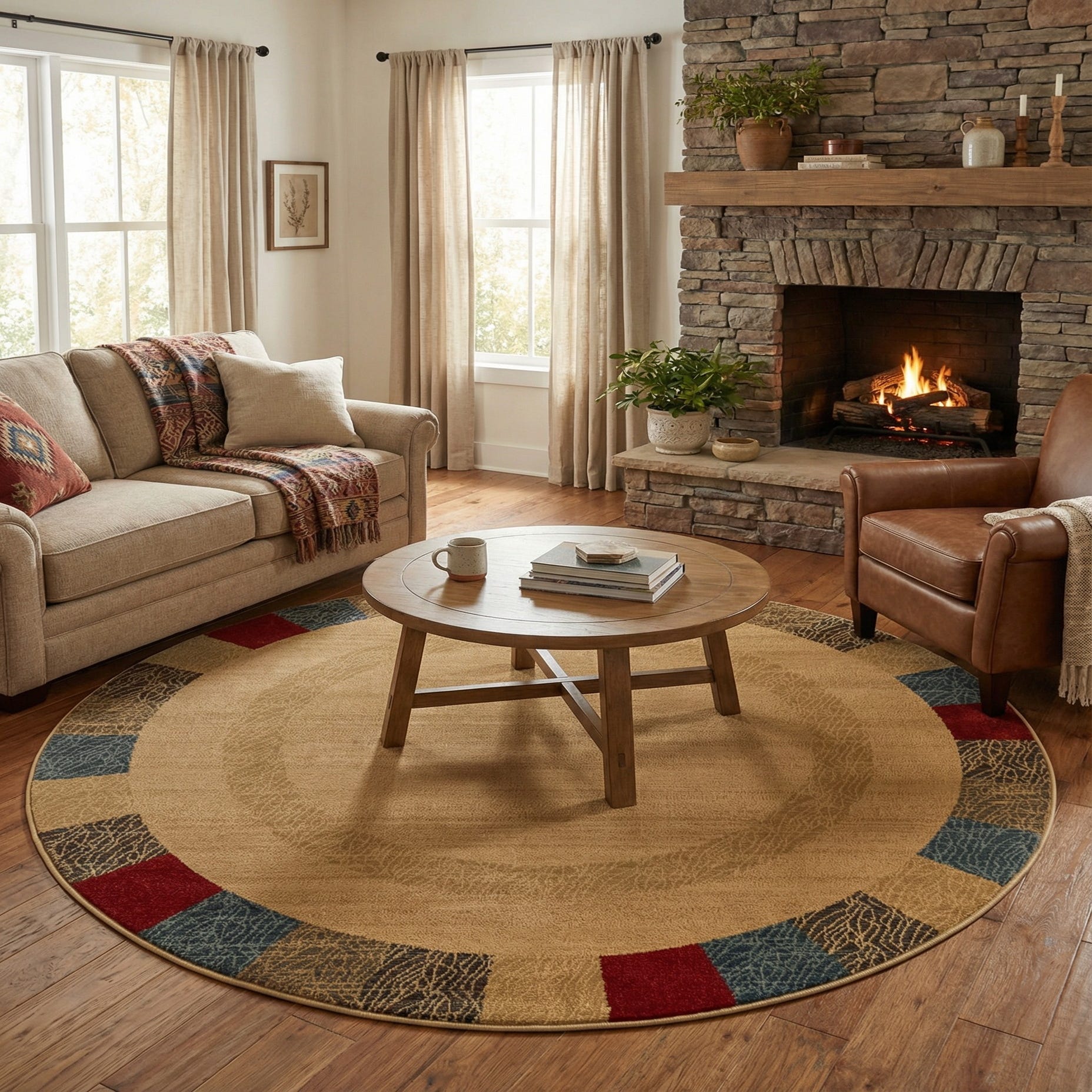 Machine-made from 100% polypropylene, the pile is low and dense with a smooth, slightly cushioned feel underfoot that works well in high-traffic areas. The neutral beige center and the mixed-color border make this piece easy to pair — place it beneath a round dining table or coffee table to define a conversation area, layer it in a casual living room with warm wood furniture and leather seating, or use it in a home office or entryway to add color without overwhelming the space. It complements transitional, modern-casual, and modestly rustic interiors, especially when teamed with navy or warm-toned accents.