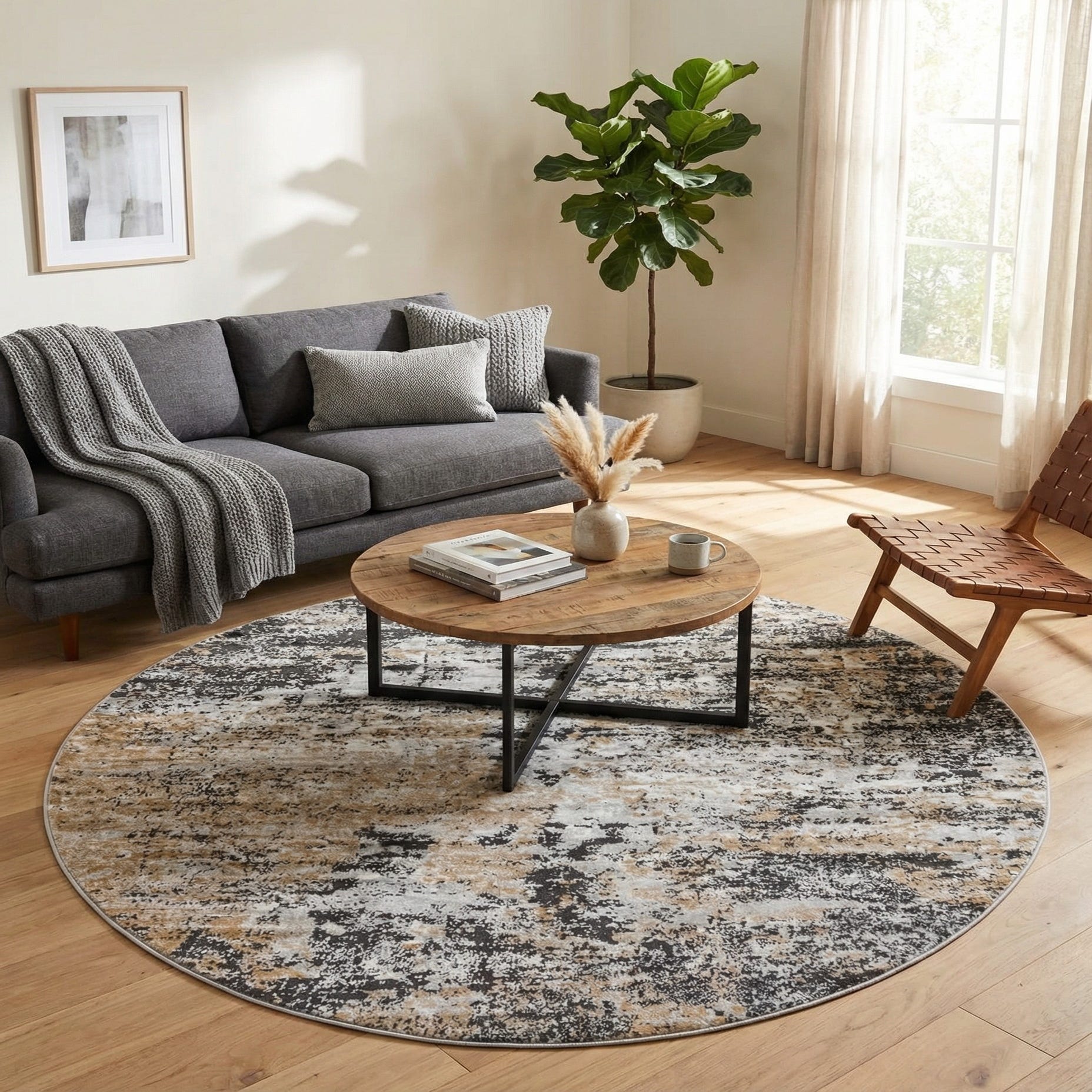 A layered, abstract pattern gives this round rug a painterly, gently distressed look. Beige forms the warm background while gray and ivory weave through the surface in mottled, cloud-like areas, with light brown accents adding depth and warmth. The machine-made construction of 75% polypropylene and 25% polyester produces a low-profile pile that feels smooth and slightly velvety underfoot, with a subtle sheen from the polyester highlights.