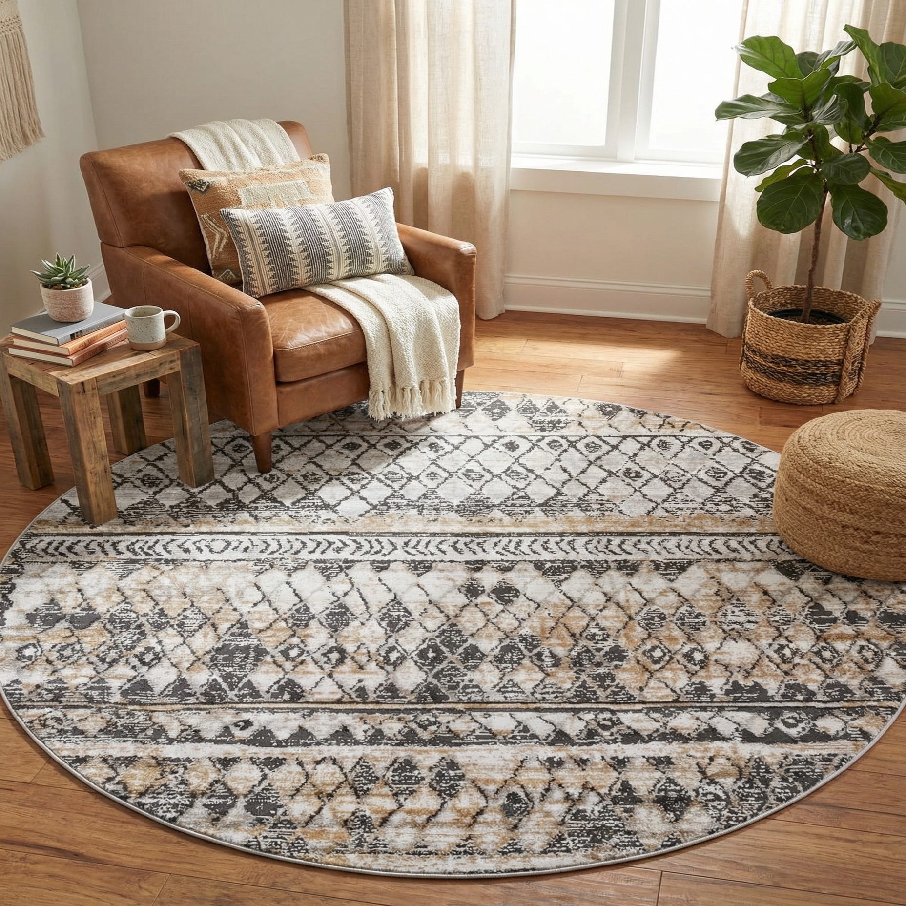 The round shape makes this rug a great anchor for a small dining table or a cozy seating group; it also works well under a bistro set, in a breakfast nook, or layered in a reading corner. Pair it with natural wood furnishings, leather or linen upholstery, and woven accessories for a relaxed, transitional look, or use it to soften minimalist or contemporary spaces by adding subtle pattern and tonal depth.