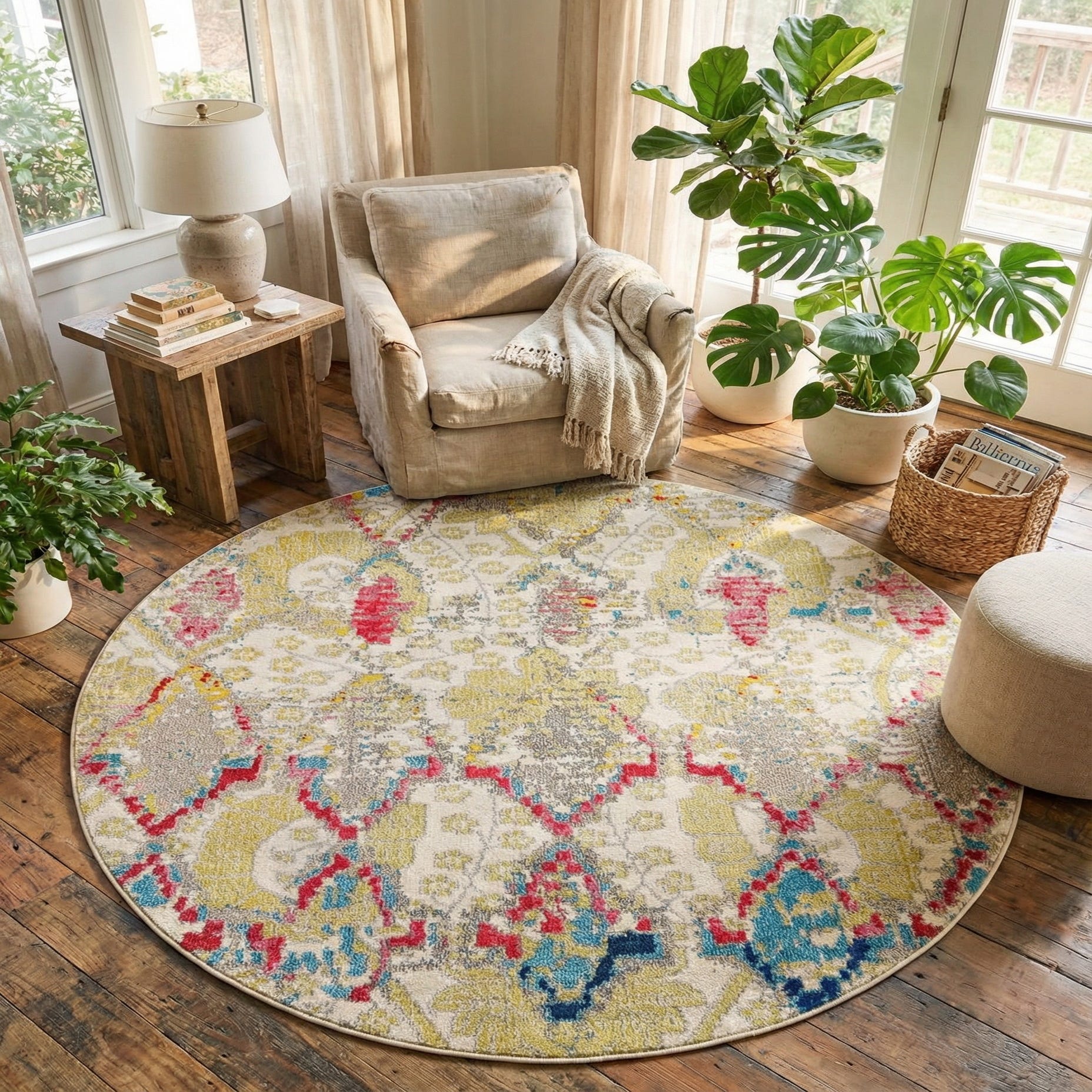 The rug is machine made of 100% polypropylene, with a low-to-medium pile that feels inviting underfoot and presents a smooth, slightly sheared surface that lets the pattern stay distinct. Place it beneath a round dining table or a compact bistro set to define a cozy eating nook, or center it under a coffee table to add a pop of color to a neutral living room. It also works well in a casual bedroom or a sunlit reading corner paired with light wood tones, linen upholstery, and woven accents for a relaxed, layered look.