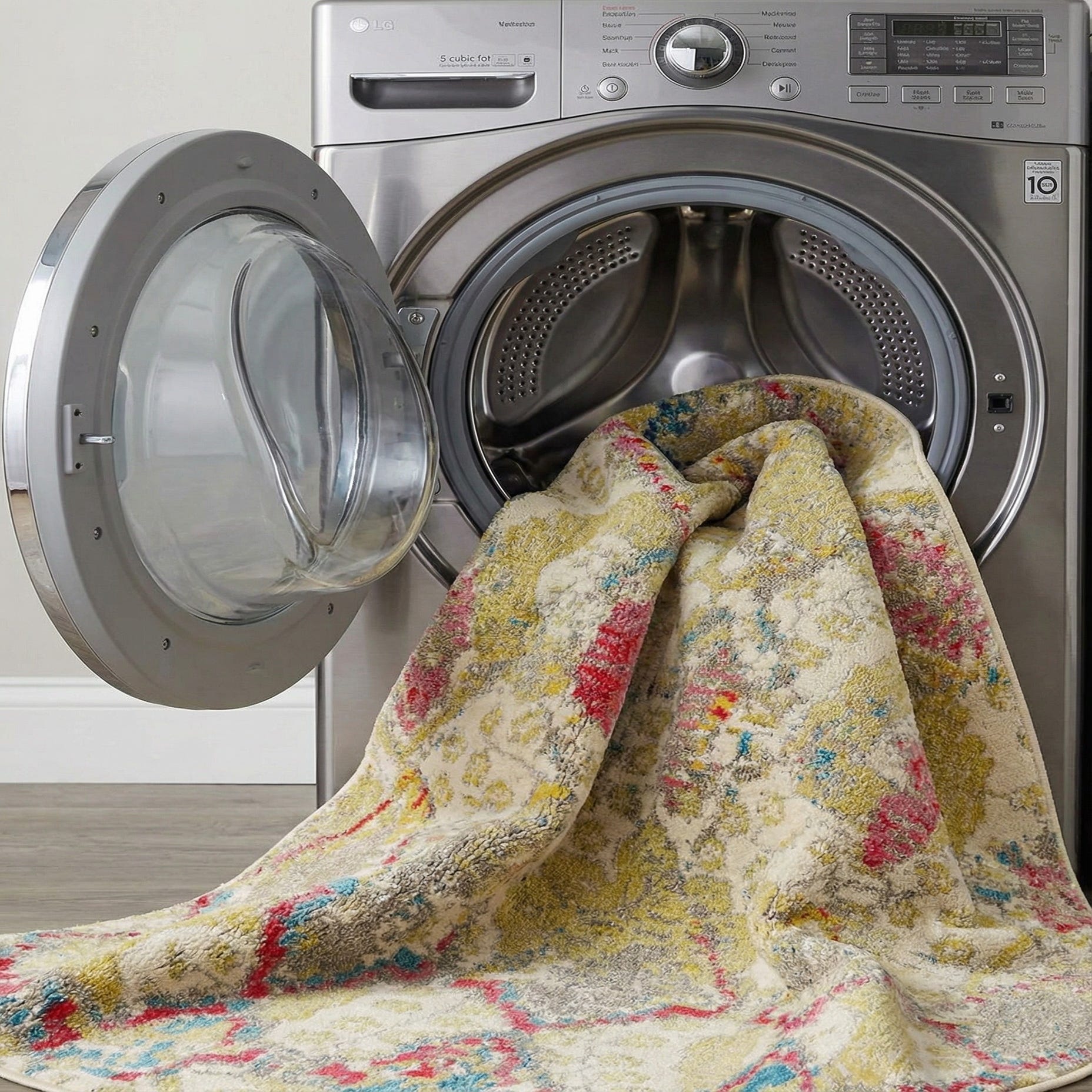 The rug is machine made of 100% polypropylene, with a low-to-medium pile that feels inviting underfoot and presents a smooth, slightly sheared surface that lets the pattern stay distinct. Place it beneath a round dining table or a compact bistro set to define a cozy eating nook, or center it under a coffee table to add a pop of color to a neutral living room. It also works well in a casual bedroom or a sunlit reading corner paired with light wood tones, linen upholstery, and woven accents for a relaxed, layered look.