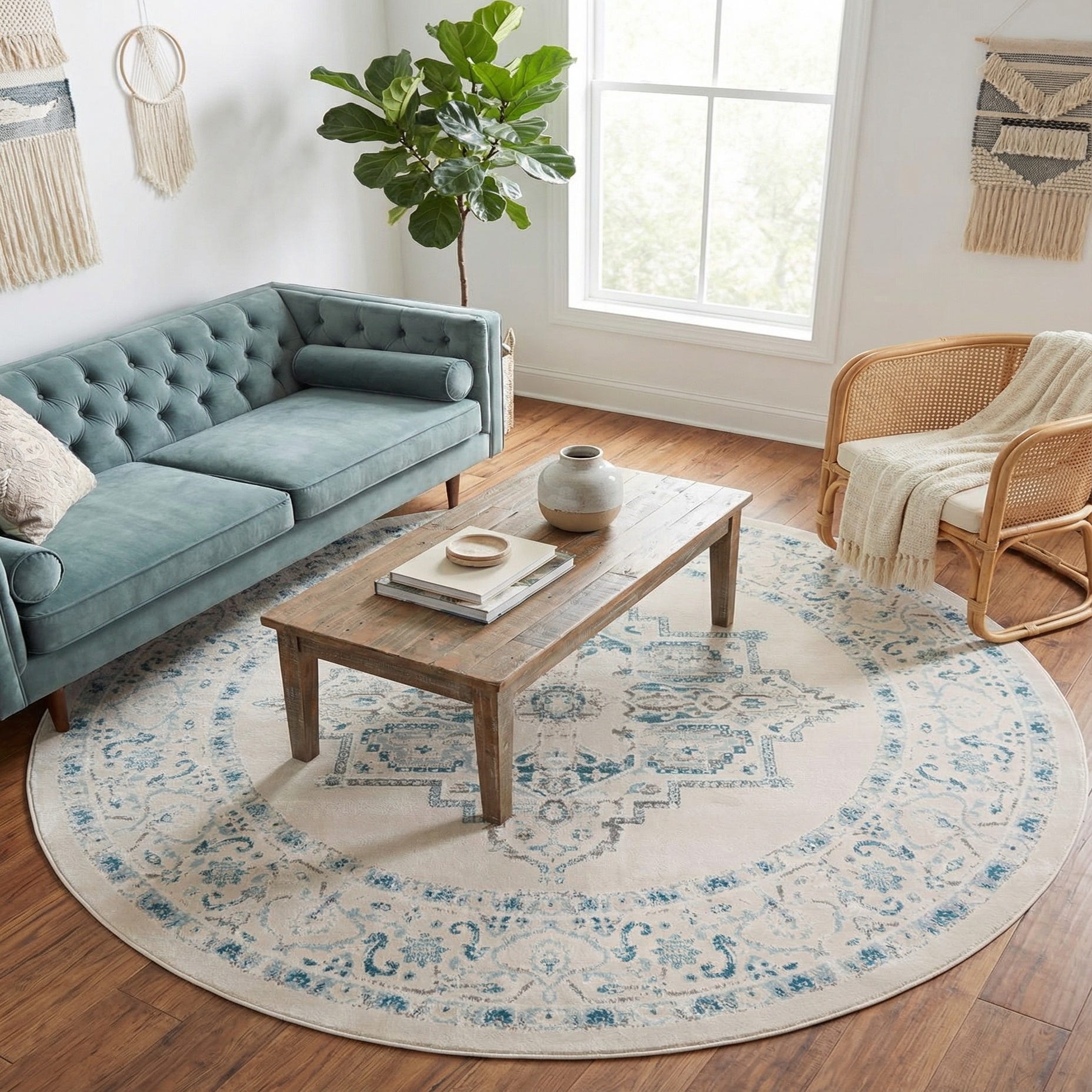 Place this round rug under a small dining table or a round coffee table to define a seating area, or use it in a sunlit bedroom to soften hardwood floors and coordinate with linen or light-wood furniture. Its neutral beige background and cool blue accents work well in coastal, transitional or modern-classical interiors, pairing easily with pale upholstery, natural textures and soft metallics for a calm, collected look.