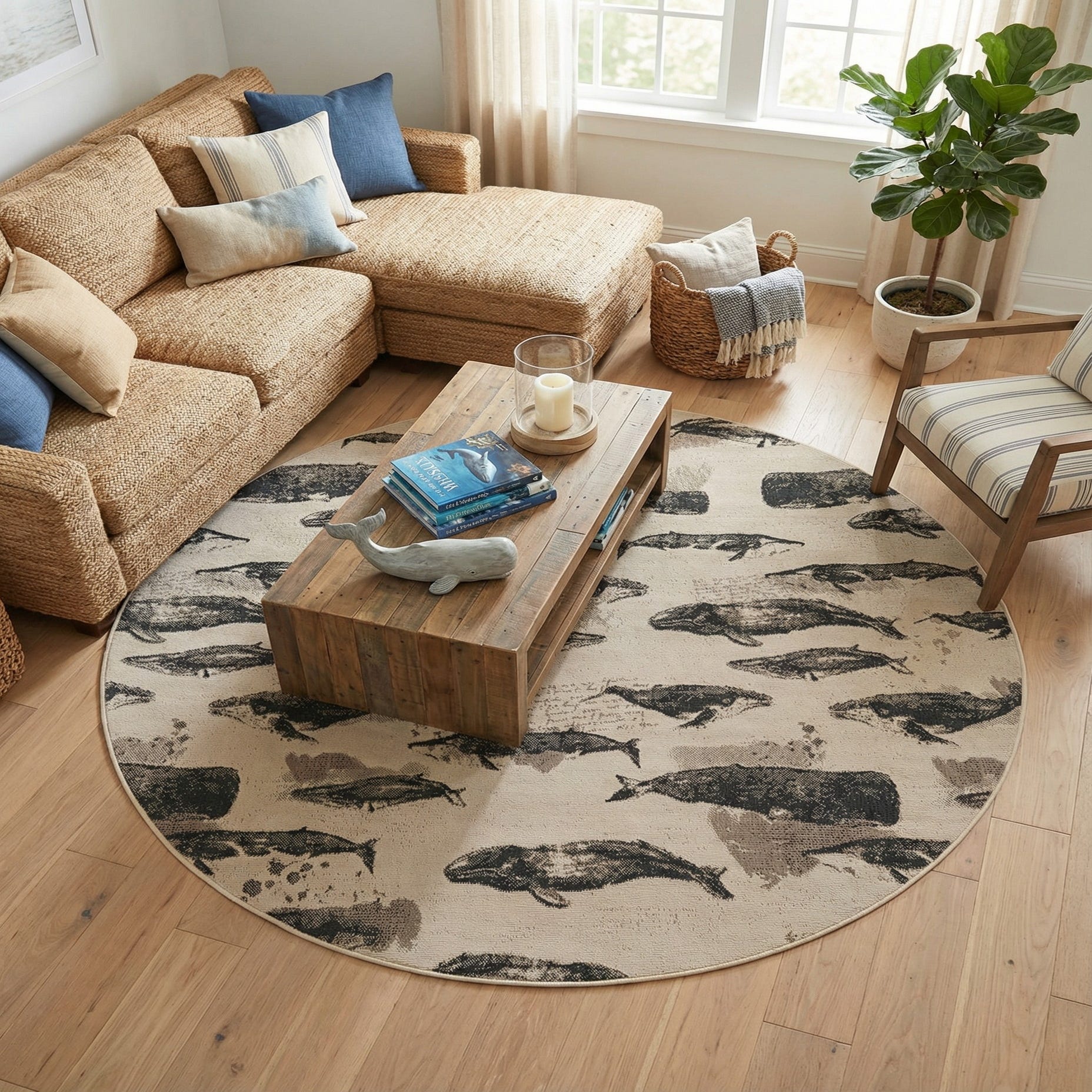 Thanks to its neutral color palette and maritime theme, this rug is well-suited for outdoor living areas, sunrooms, or coastal-themed interiors. It can serve as a focal point on a wooden deck, complementing natural textures and tones, or anchor a casual seating arrangement by the poolside, enhancing the overall ambiance with its charming pattern.