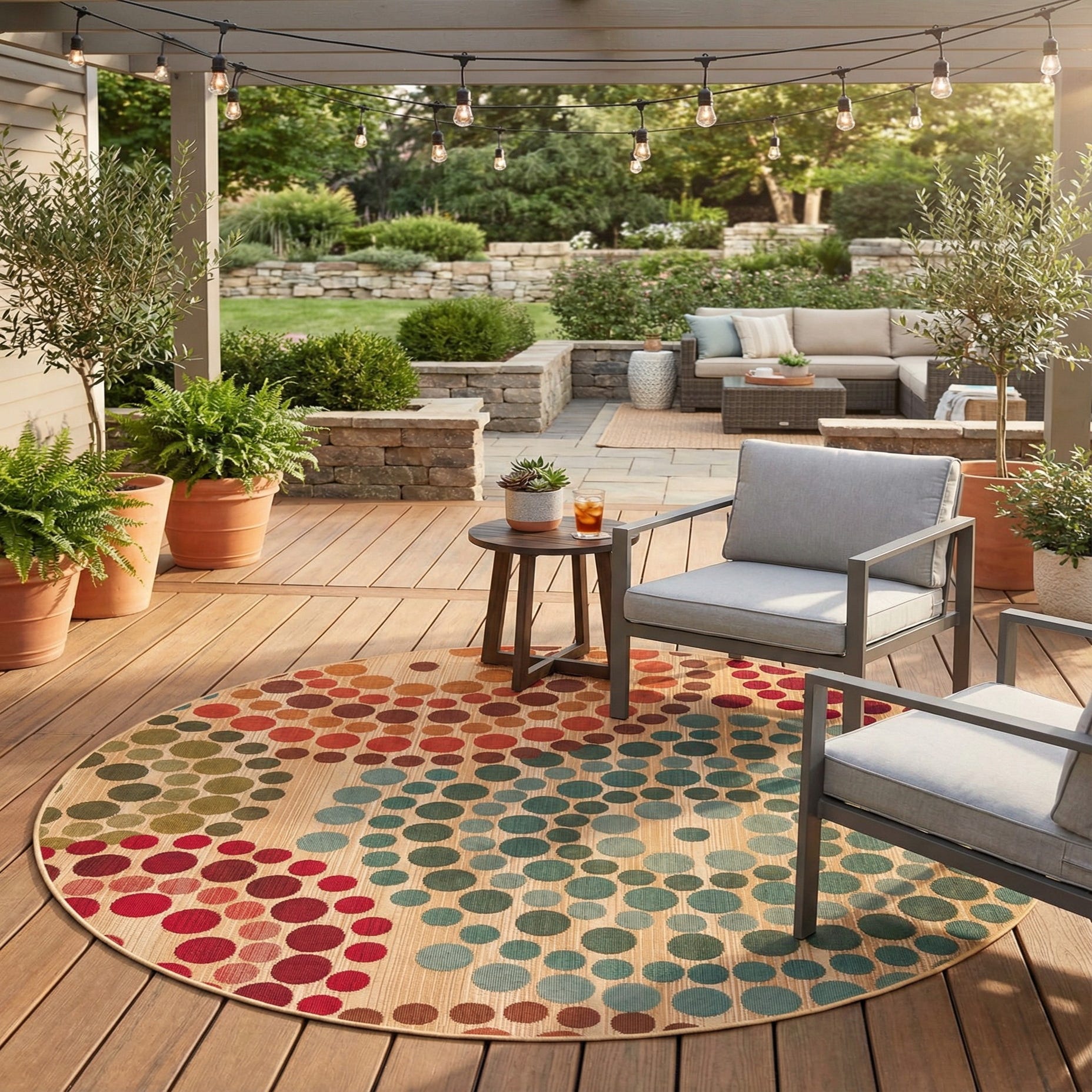 A playful, modern polka-dot pattern brings movement to a warm beige ground. Circles in graduated sizes cluster and overlap across the surface in a palette of blue, green, olive, gold, brown, orange and red, creating a layered, graphic look that reads both lively and composed. Machine made of 100% polypropylene, the rug has a low-profile, slightly ribbed texture that feels smooth and firm underfoot while holding the color saturation of the printed dots.
