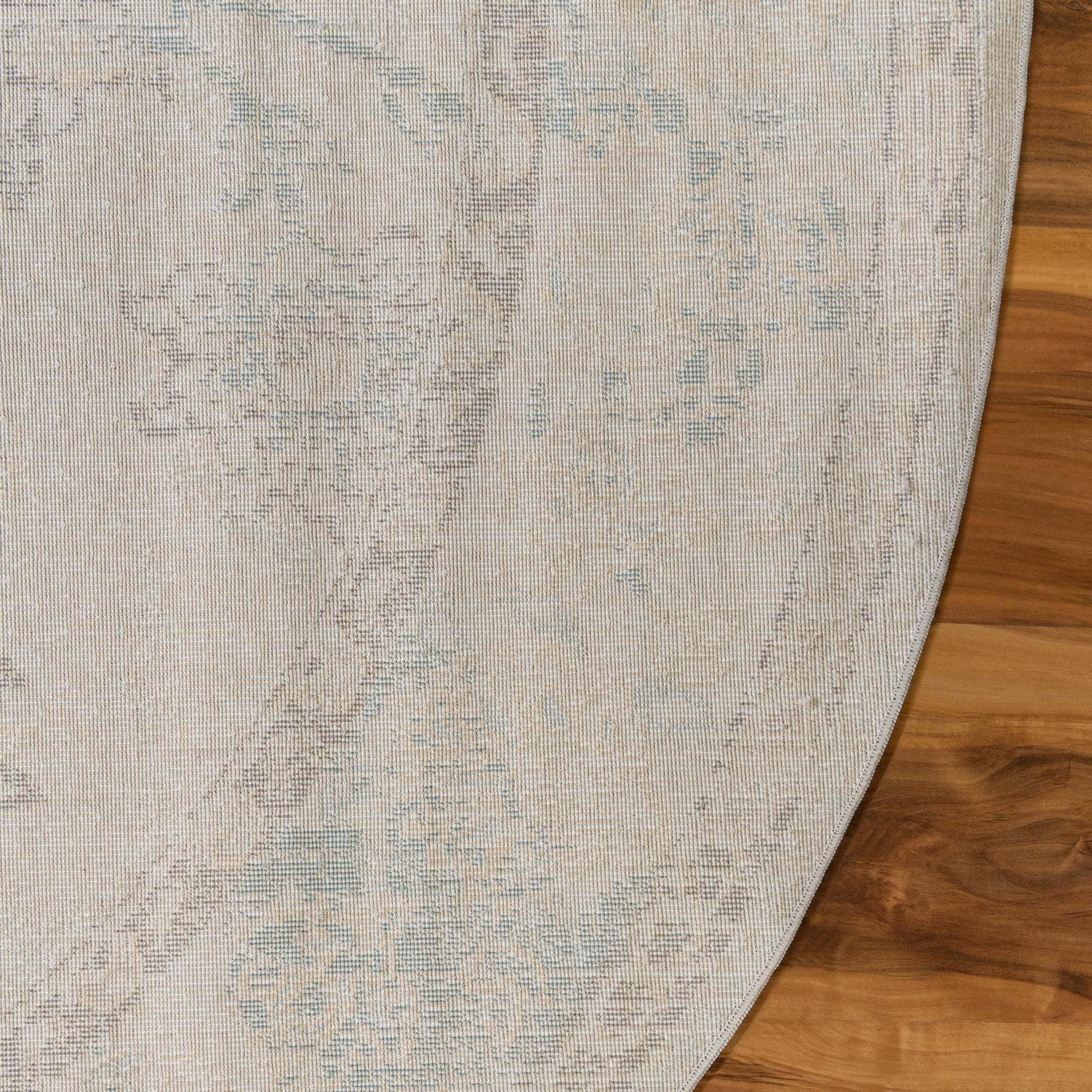 A soft beige ground sets a calm foundation for an antique-inspired medallion and floral pattern rendered in gray, light brown, and cool blue accents. The design blends traditional arabesque motifs with a subtly distressed border, giving the rug a lived-in, vintage character. Machine made from 100% polypropylene, the rug has a low, soft pile with a smooth hand and a faint luster that catches light gently without overwhelming the room.