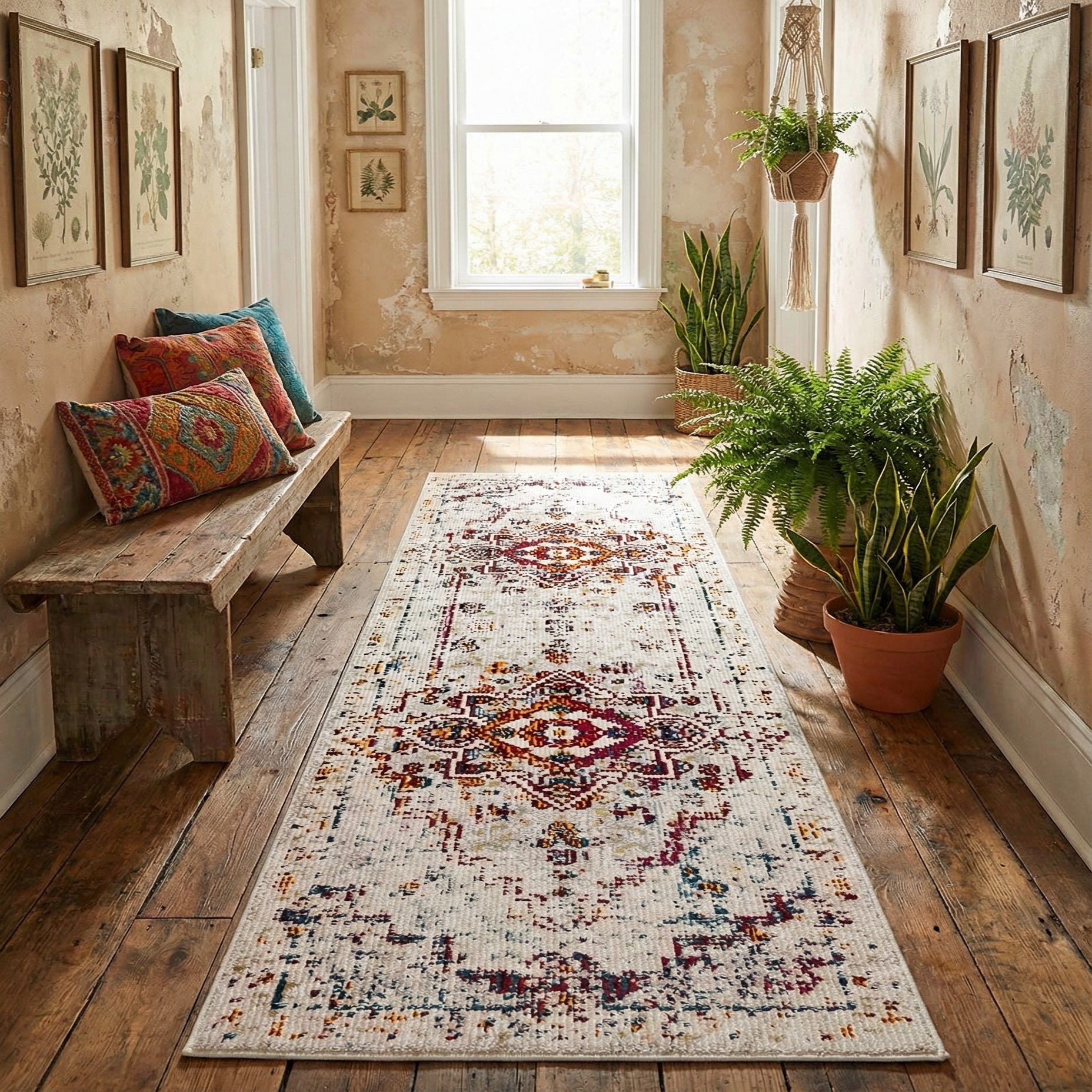 Machine-made from 100% polypropylene, the rug has a low-profile pile and a tightly woven surface that feels smooth underfoot with a subtle textured quality where the pattern rises and falls. Its scale and color palette make it well suited for hallways, entryways, or beside a bed; it also works as a kitchen runner to add warmth to a narrow workspace. Pair it with warm wood floors, neutral sofas, or layered bohemian and transitional interiors—draw on the rug’s burgundy and navy accents for pillows or artwork to create a cohesive look.