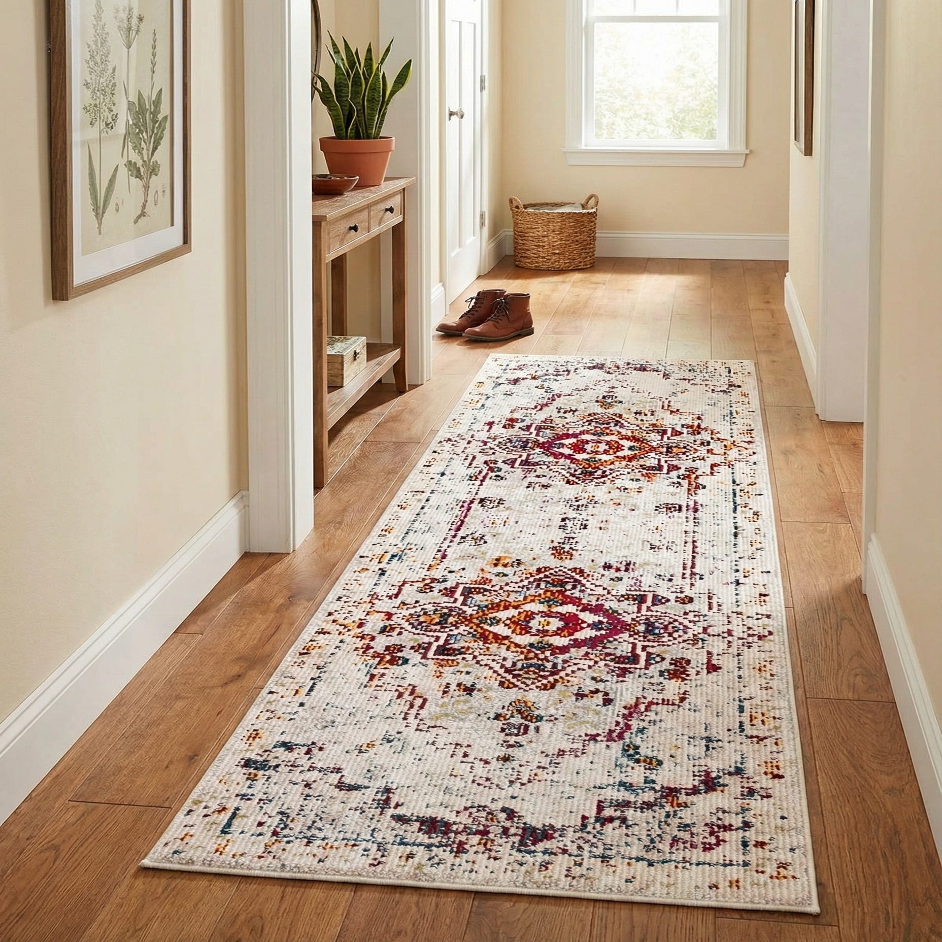 A softly distressed medallion runner set against a beige ground gives this piece a vintage-inspired character. Central geometric medallions in burgundy and red anchor the design while touches of navy blue, blue, orange and yellow appear as scattered accents and tiny floral motifs. Cream highlights and artful fading create a relaxed, lived-in look that keeps the pattern from feeling formal, with softened borders and fine flecks of color that add visual depth along the length of the runner.