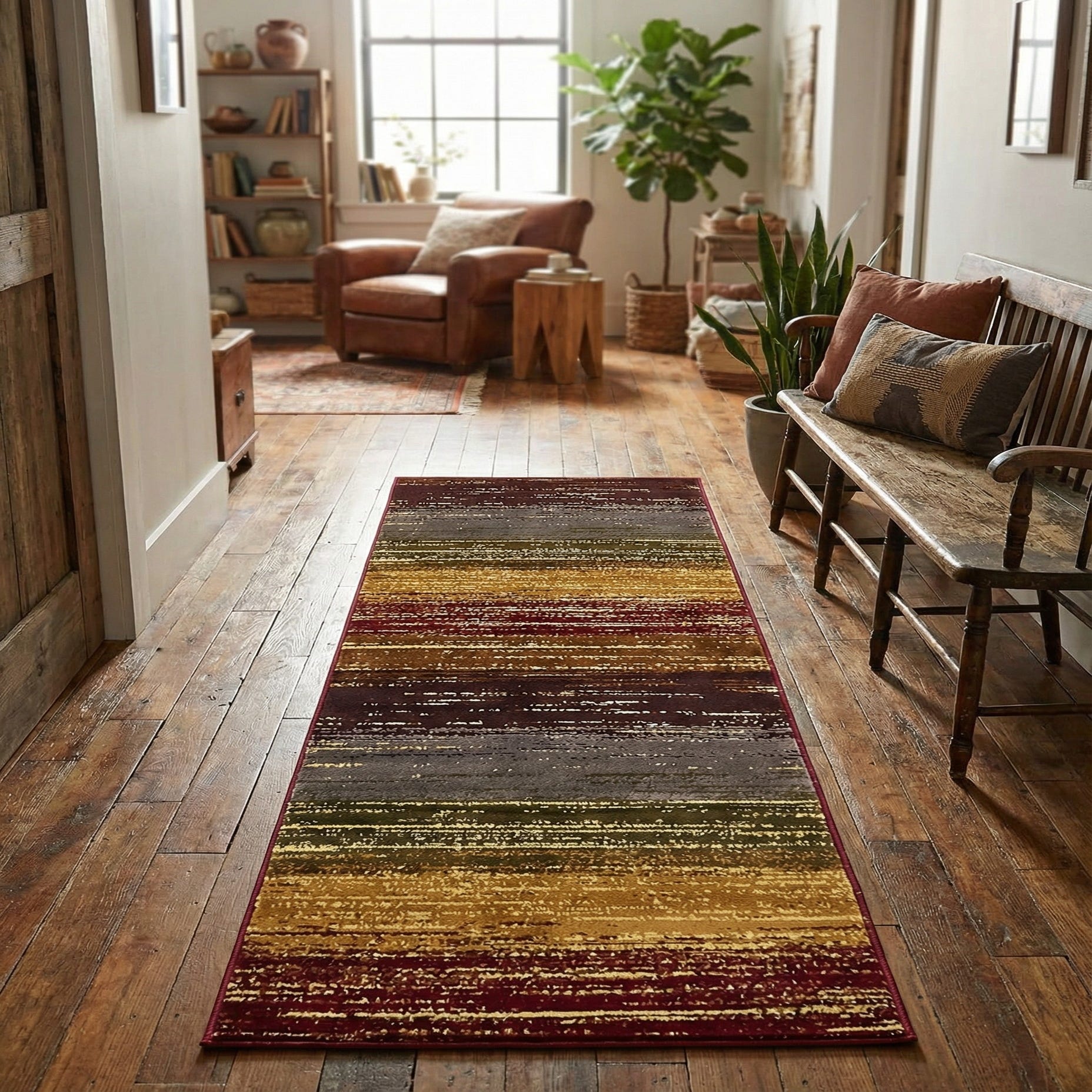 Ideal for a corridor, entry, galley kitchen, or alongside a bed, this runner brings color and linear movement to narrow areas. It pairs easily with warm wood floors and neutral furnishings when you want the rug to anchor a room, or with mixed finishes and eclectic decor to introduce burgundy and olive highlights. The horizontal striations help lead the eye along a hall while the balanced palette works well in contemporary, transitional, or casual interiors.