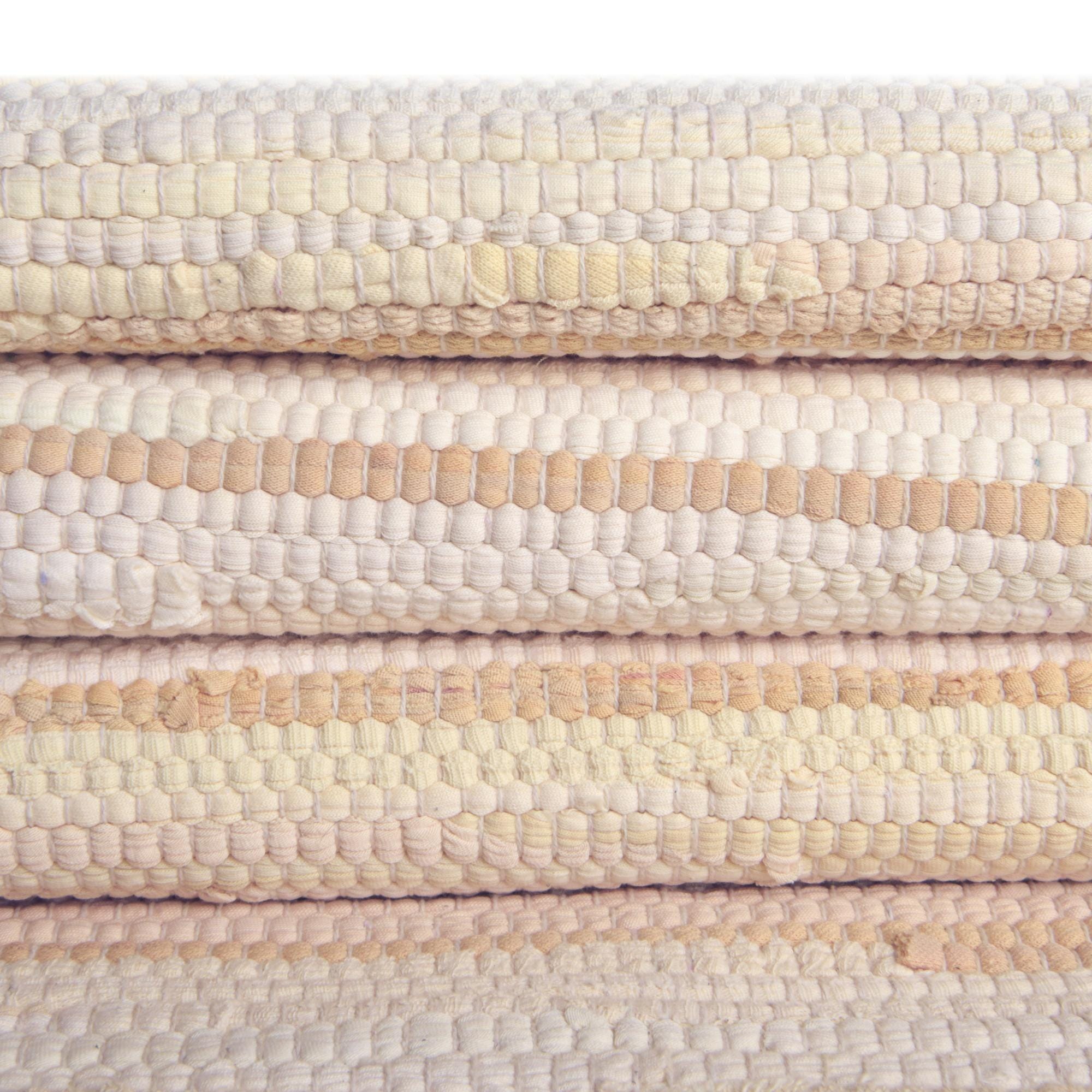 Hand-woven from 90% cotton and 10% polyester, this runner has a flat, low-profile weave with a gently slubby texture you can feel beneath your feet. The beige background is threaded with narrow, irregular ivory bands that create a relaxed striped pattern; the result is a casual, tactile surface with soft color variation and short fringe at each end. The cotton gives a comfortable hand while the polyester content adds subtle durability and structure to the weave.