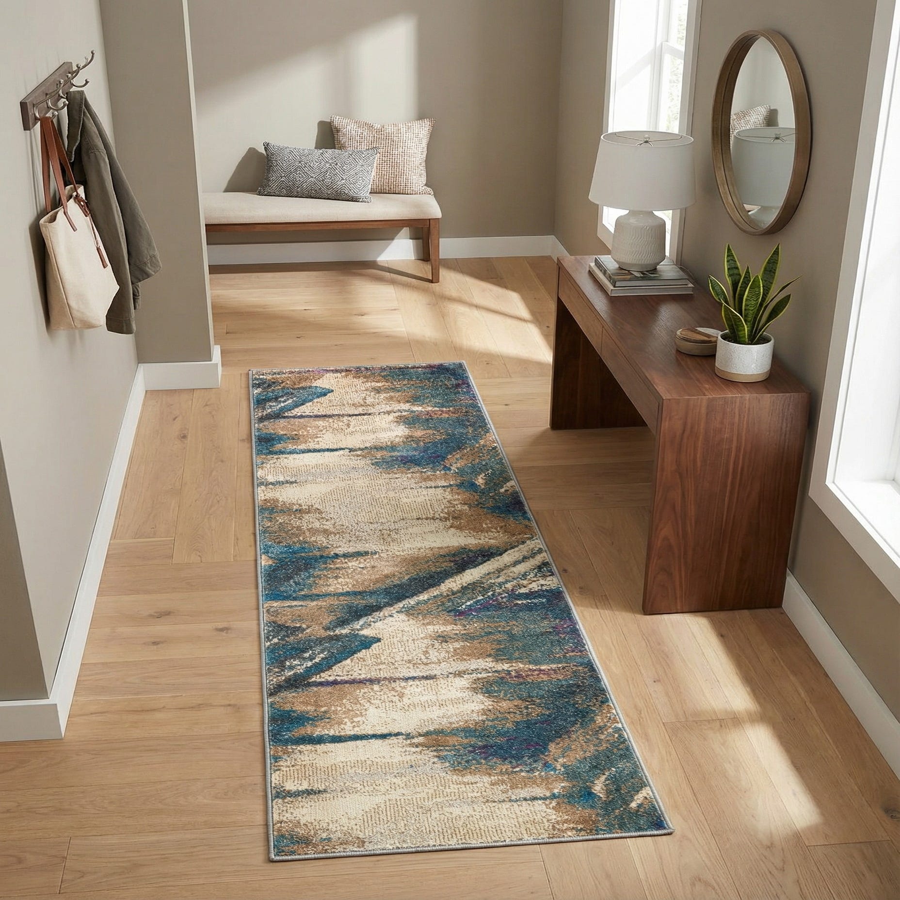 This machine-made runner is constructed from 60% polypropylene and 40% polyester, with a soft, low-profile pile that offers a gentle, slightly silky hand and a subtle sheen. The design is an abstract, painterly pattern that layers washes of teal, blue and green over a warm beige ground, punctuated by tan and violet accents. The overall effect is a weathered, watercolor-like surface where color shifts and blurred edges create movement across the rug, while the pile’s texture adds depth without being bulky.