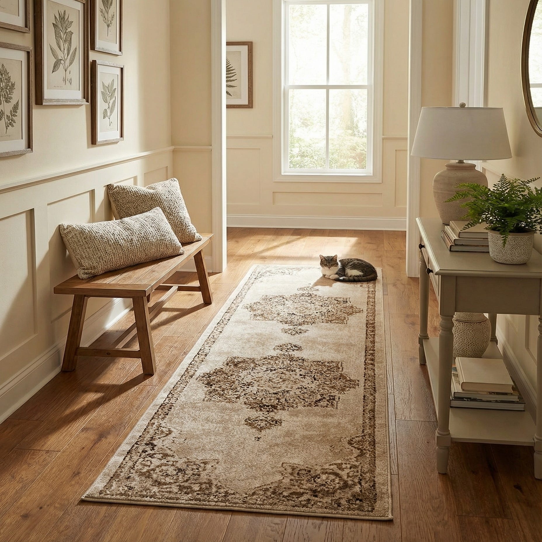 This runner works well in a hallway or entry where the long proportion guides the eye, and it also layers nicely along a kitchen aisle or the side of a bed to add a grounded, traditional touch. Pair it with warm wood floors, neutral upholstery, and natural fibers like linen or leather for a cohesive, lived-in look; it also complements transitional and farmhouse interiors that favor muted, earthy palettes.