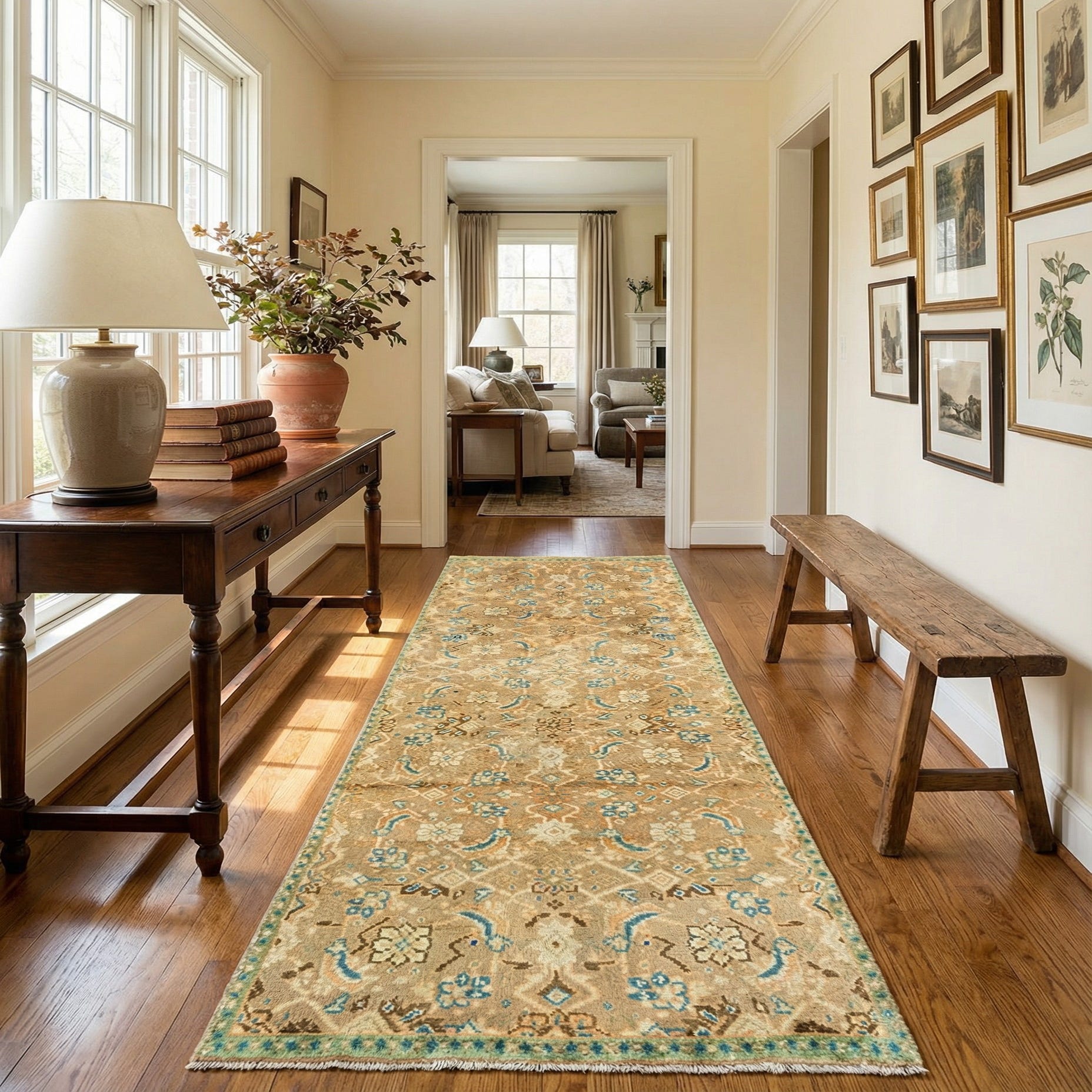 Designed as a runner, this piece is well-suited to hallways, entryways or alongside a bed, where its narrow shape and muted palette can anchor circulation zones without overwhelming a space. It pairs naturally with warm wood floors, neutral upholstery and soft blue or sage accents for a layered, serene look, and also complements transitional or traditional furnishings when you want to introduce pattern and color in a restrained way. Hand made of wool.