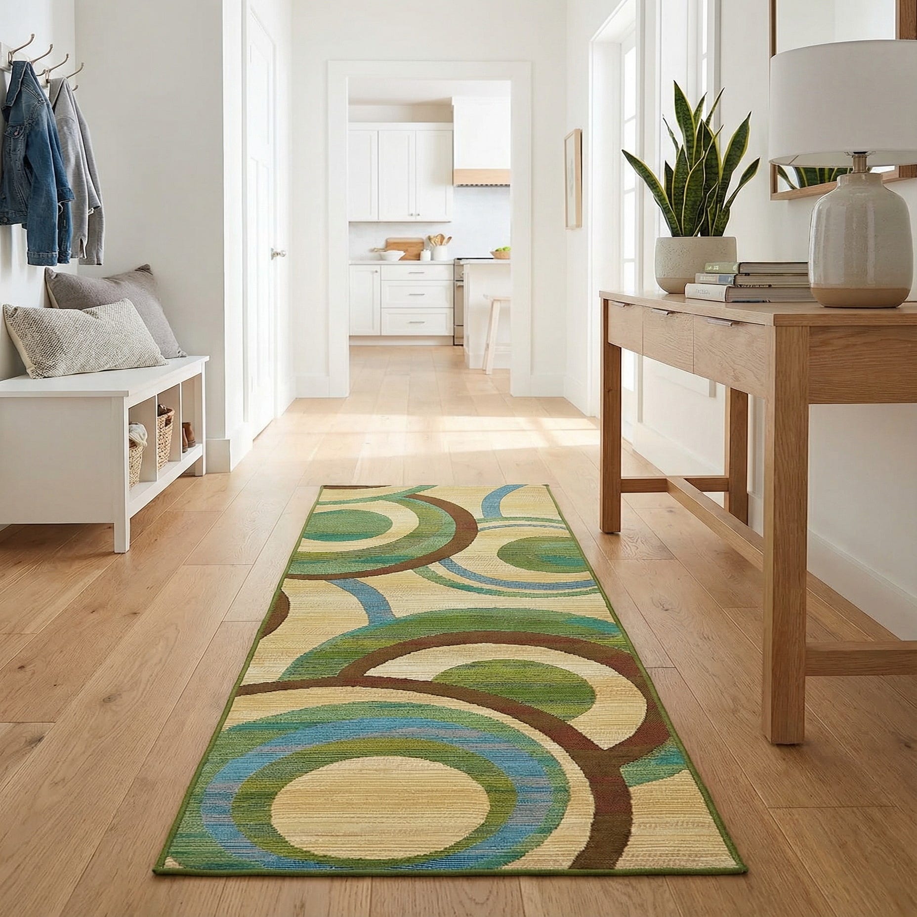 Warm beige provides a calm, neutral ground for a modern geometric pattern of overlapping concentric circles and sweeping arcs in blue, green and brown. The rings alternate in width and color, producing a layered, rhythmic look that reads contemporary with a mid-century modern influence. The design has a clean, graphic quality that anchors narrow spaces without overwhelming them.