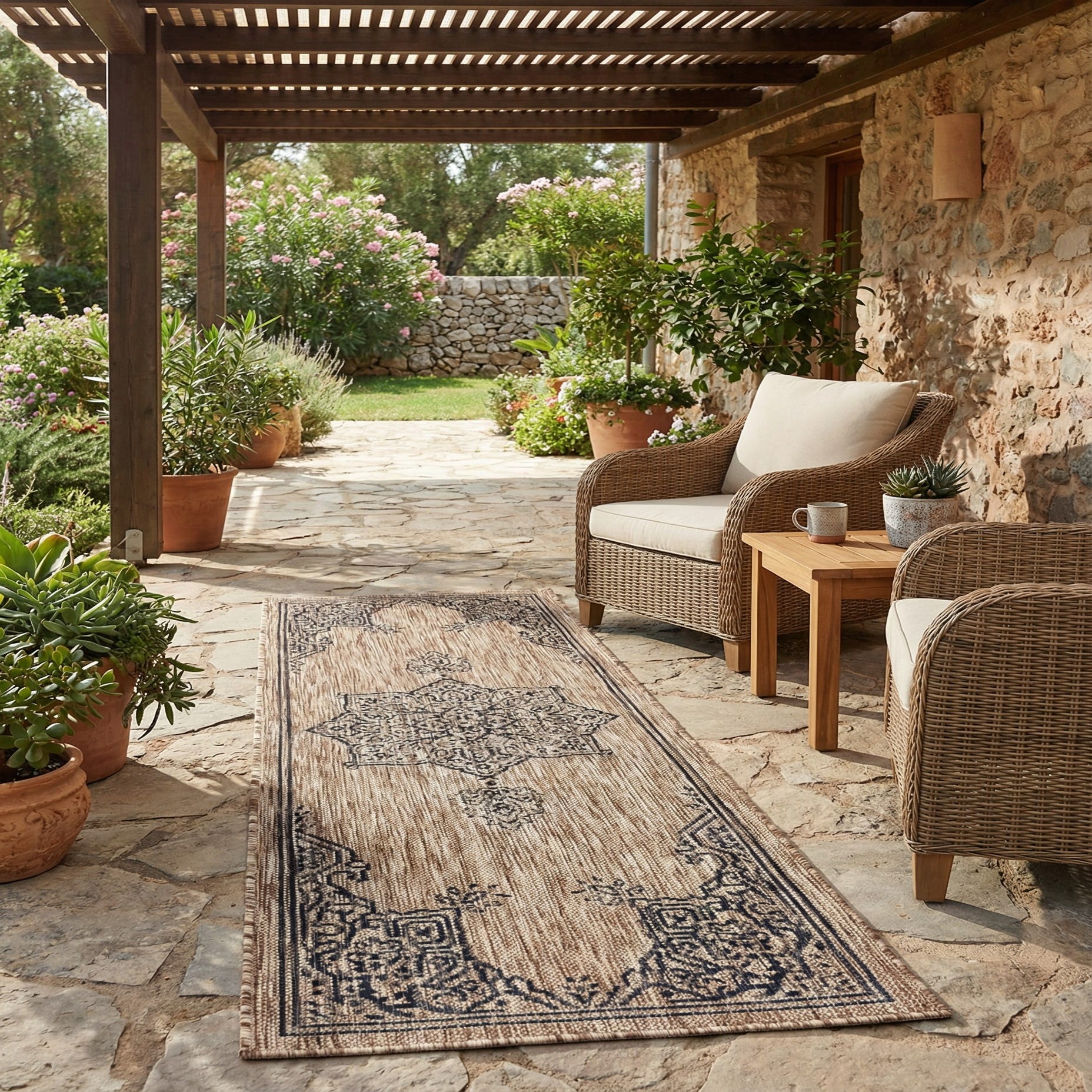 Machine-made from 100% polypropylene, the rug has a low-profile, slightly ribbed surface that feels firm beneath the foot and holds the pattern crisply. It pairs naturally with weathered wood tones, painted cabinetry, wicker or rattan furnishings, and iron or matte-black accents. Use it to anchor an entryway or hallway, run alongside a kitchen island, or bring structure to a covered porch or mudroom where a traditional, grounded look is wanted.