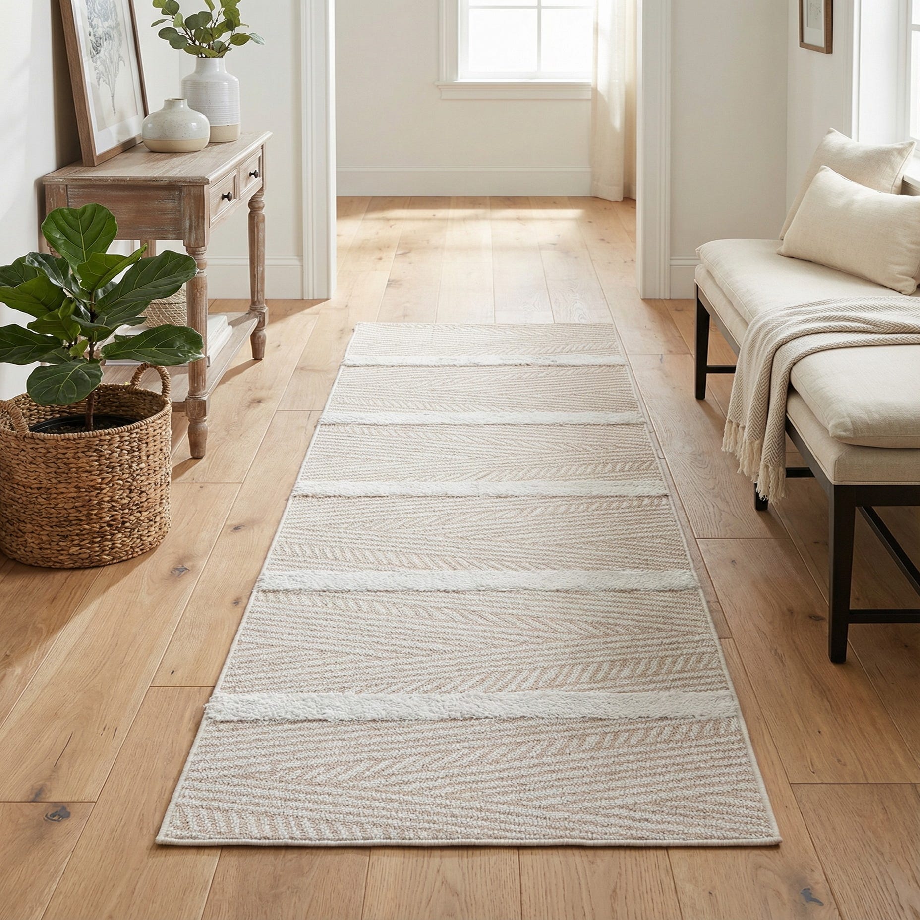 This runner works well where you want a calm, grounded look with a touch of texture: pair it with light wood or rattan furnishings in a coastal or modern farmhouse entry, lay it along a hallway to guide circulation, or place it at the foot of a bed to soften a bedroom’s hardwood floor. The neutral beige and ivory palette coordinates easily with linen upholstery, muted greens, and natural fibers for a relaxed, cohesive interior.