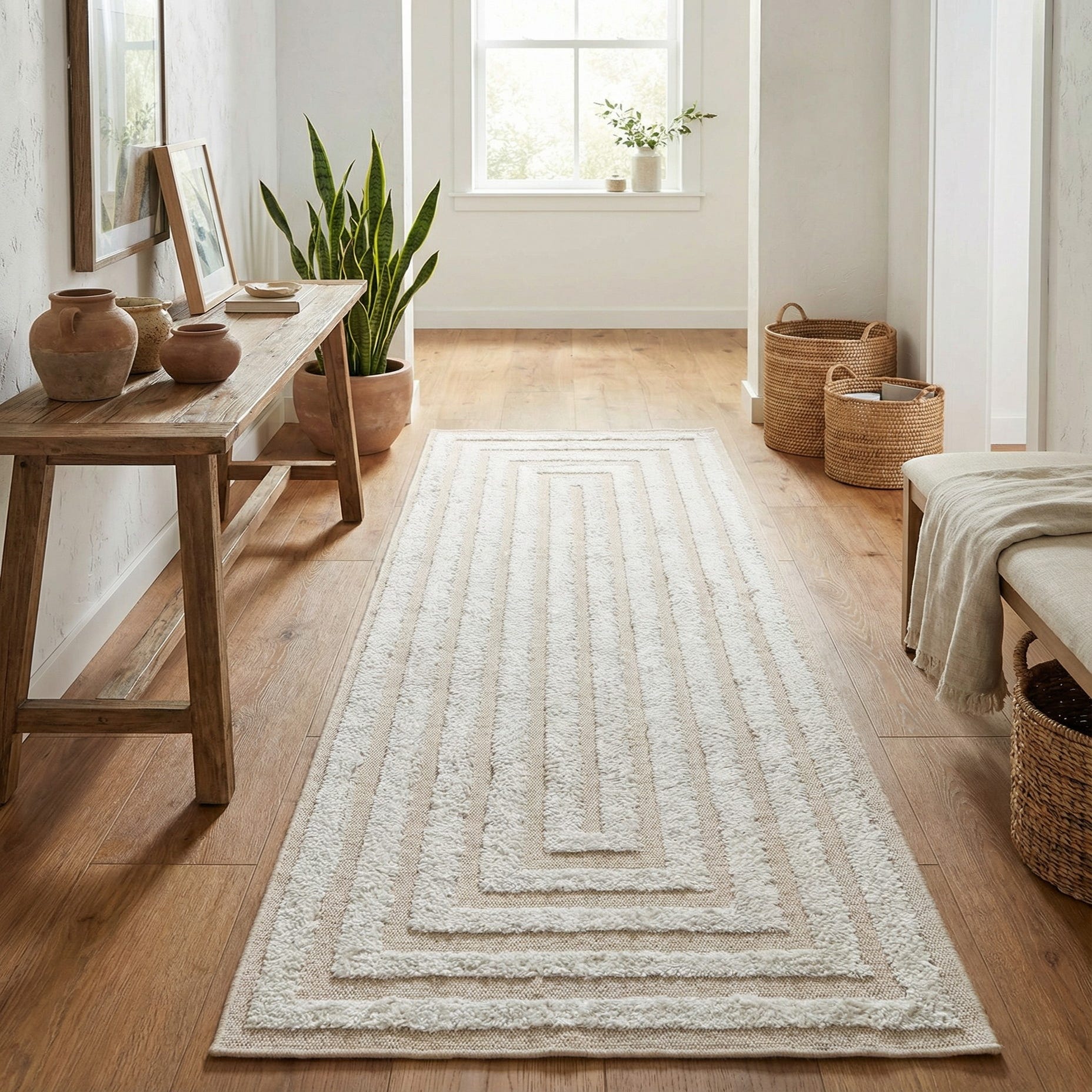 This runner is designed to anchor narrow spaces and guide the eye, making it a strong choice for hallways, entryways, the kitchen aisle, or laid alongside a bed. The neutral beige and ivory palette complements light wood finishes, linen upholstery, and simple metal accents, and works well with modern, Scandinavian, coastal, or contemporary farmhouse interiors.