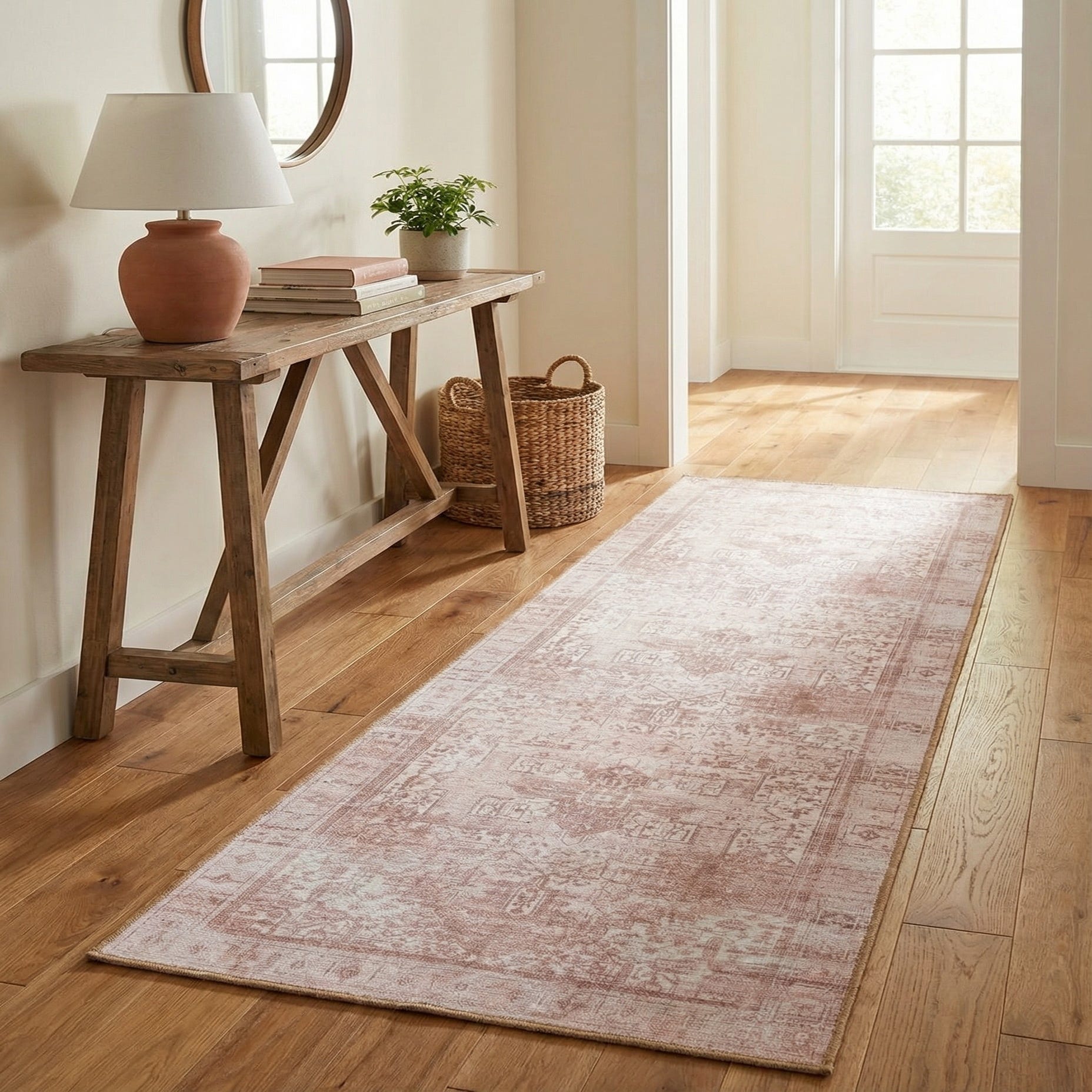 A 6 ft runner rug with a faded brown and ivory oriental medallion pattern, perfect for a hallway.