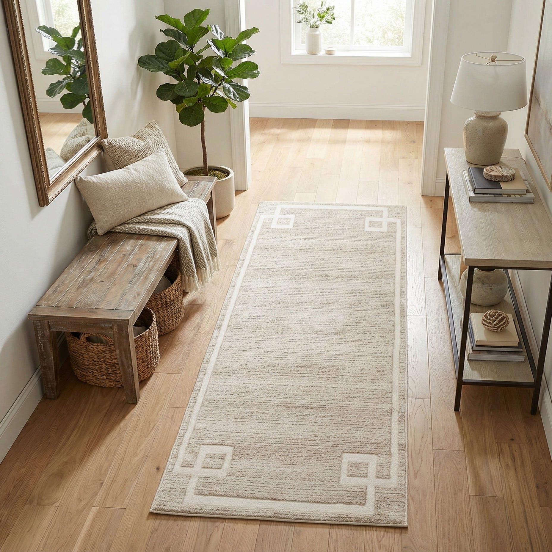 A clean, contemporary runner with a quietly patterned field in warm beige punctuated by light brown striations. An ivory geometric border frames the rug, with squared corner motifs that add a subtle architectural detail without overwhelming the design. The overall look balances modern minimalism with a soft, textural presence that complements neutral color palettes.
