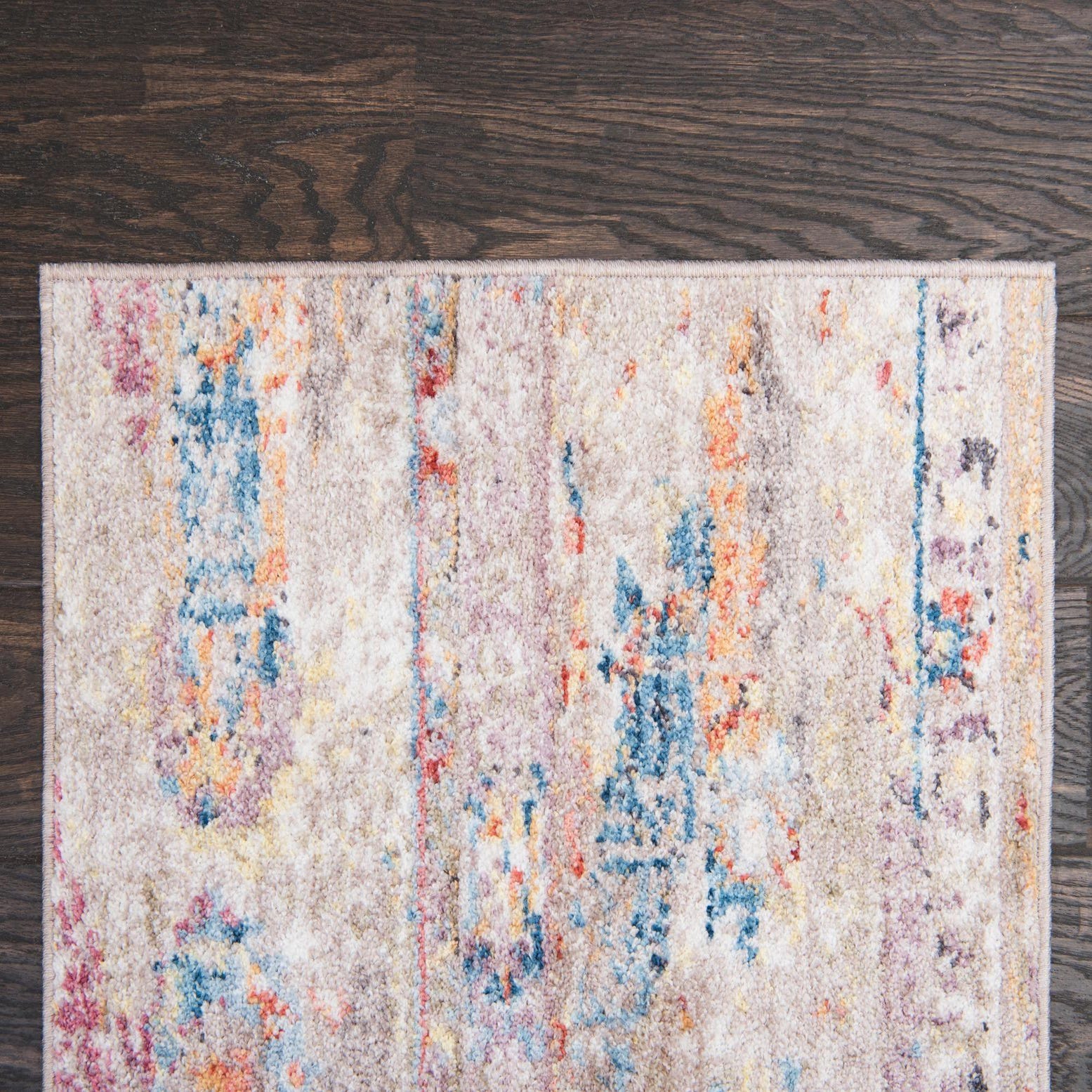 A soft beige ground sets a neutral stage for a worn, vintage-inspired pattern rendered in painterly strokes of blue, gold, orange, yellow and pink, with gray and ivory threads adding subtle depth. The design combines faded medallion hints with vertical, striated marks for an abstract, timeworn look that feels both relaxed and intentional. Machine made of 100% polyester (space-dyed yarn), the surface has a supple, slightly plush hand and an even, low-profile texture that cushions underfoot while keeping a refined silhouette.