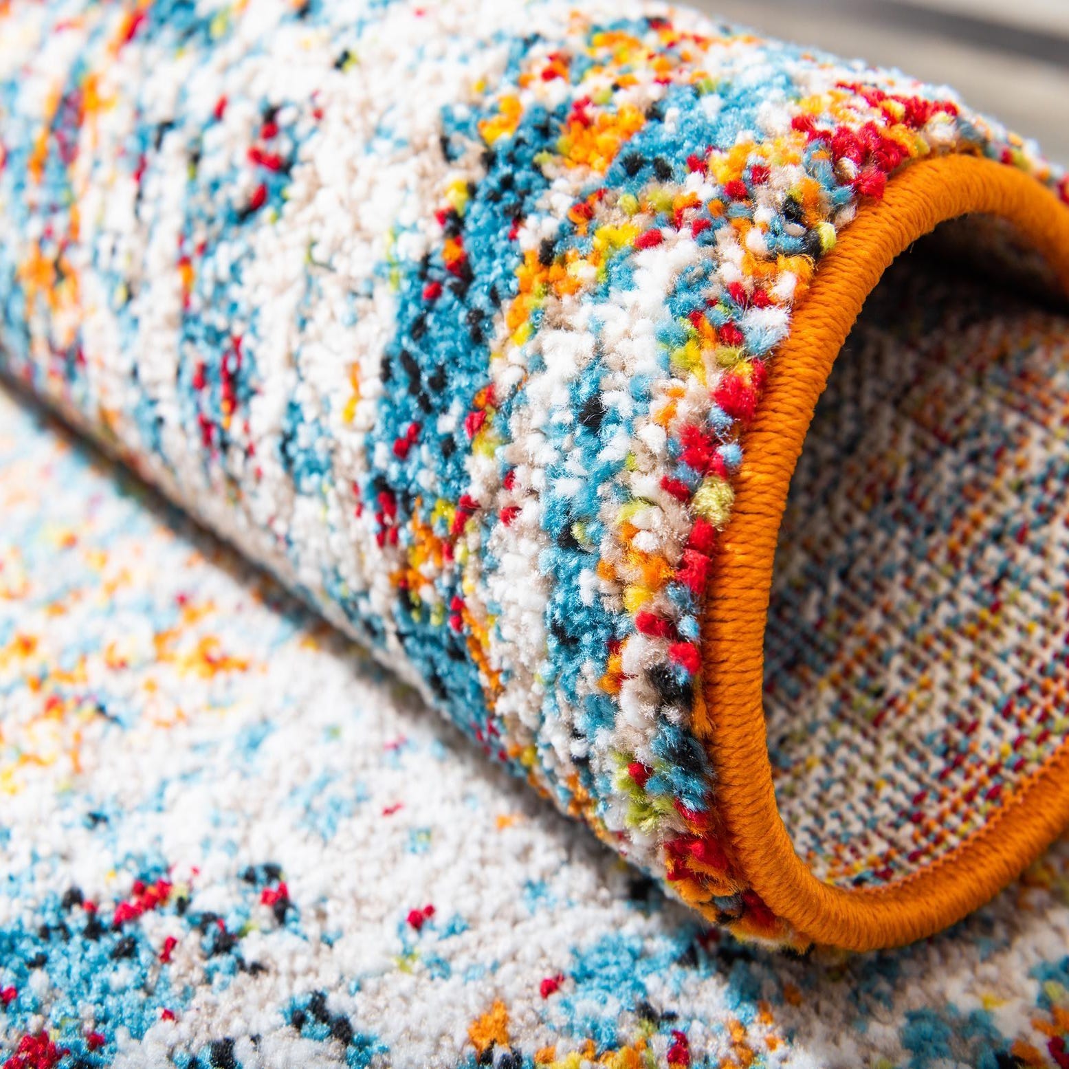A warm beige field forms the backdrop for a layered, painterly pattern that blends a faded medallion with mottled border bands. Navy blue and teal tones anchor the ends of the rug, while splashes of orange and red and touches of gray and ivory are woven through the surface for a lively, lived-in appearance. Machine-made from 100% polypropylene, the rug has a dense, low-to-medium pile that feels soft underfoot and showcases the multicolor texture with subtle depth.