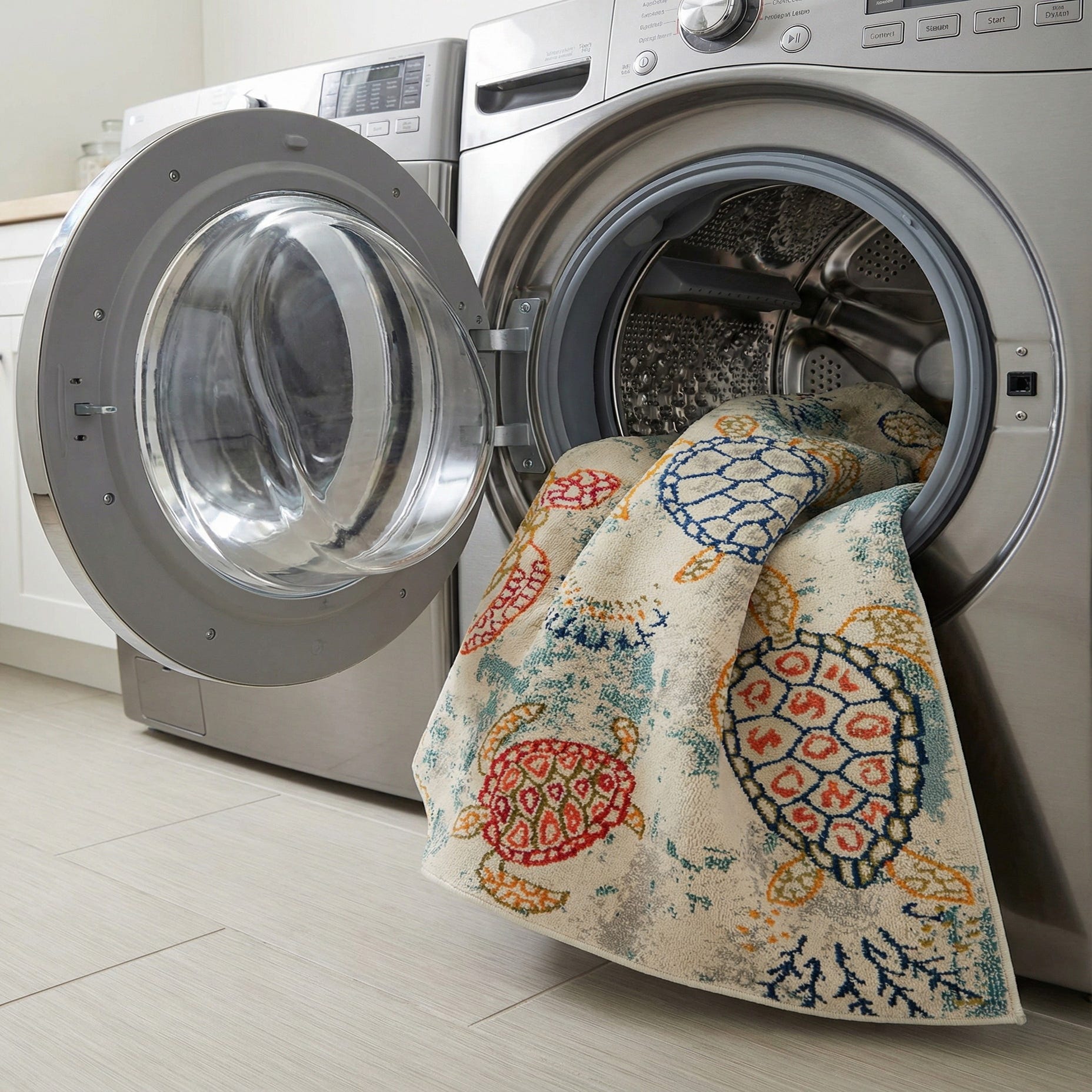 The Amalfi Collection rug presents a playful marine tableau with a charming assembly of turtles, each adorned with various patterns that add a delightful visual texture. Its 6-foot square dimension is crafted from 100% polypropylene, a material known for its durability and ease of maintenance. This rug showcases a beige background, harmoniously layered with hues of blue, green, navy blue, orange, red, gold, and gray to create a vibrant canvas that evokes the essence of oceanic life.