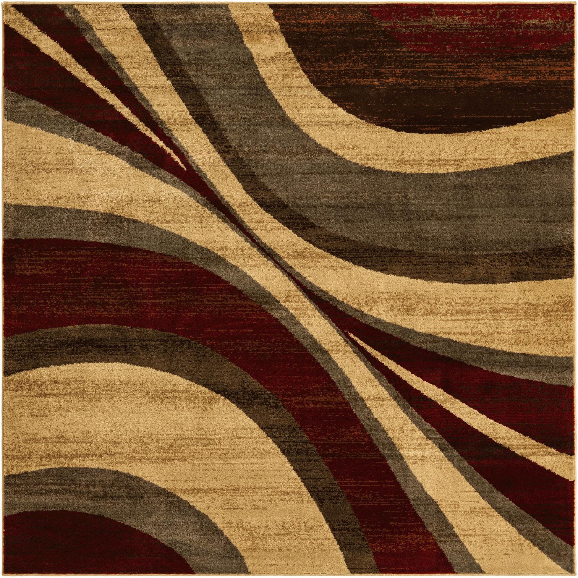 A square Cafe Collection rug featuring a modern abstract pattern with sweeping curves in shades of brown, tan, cream, and deep red.