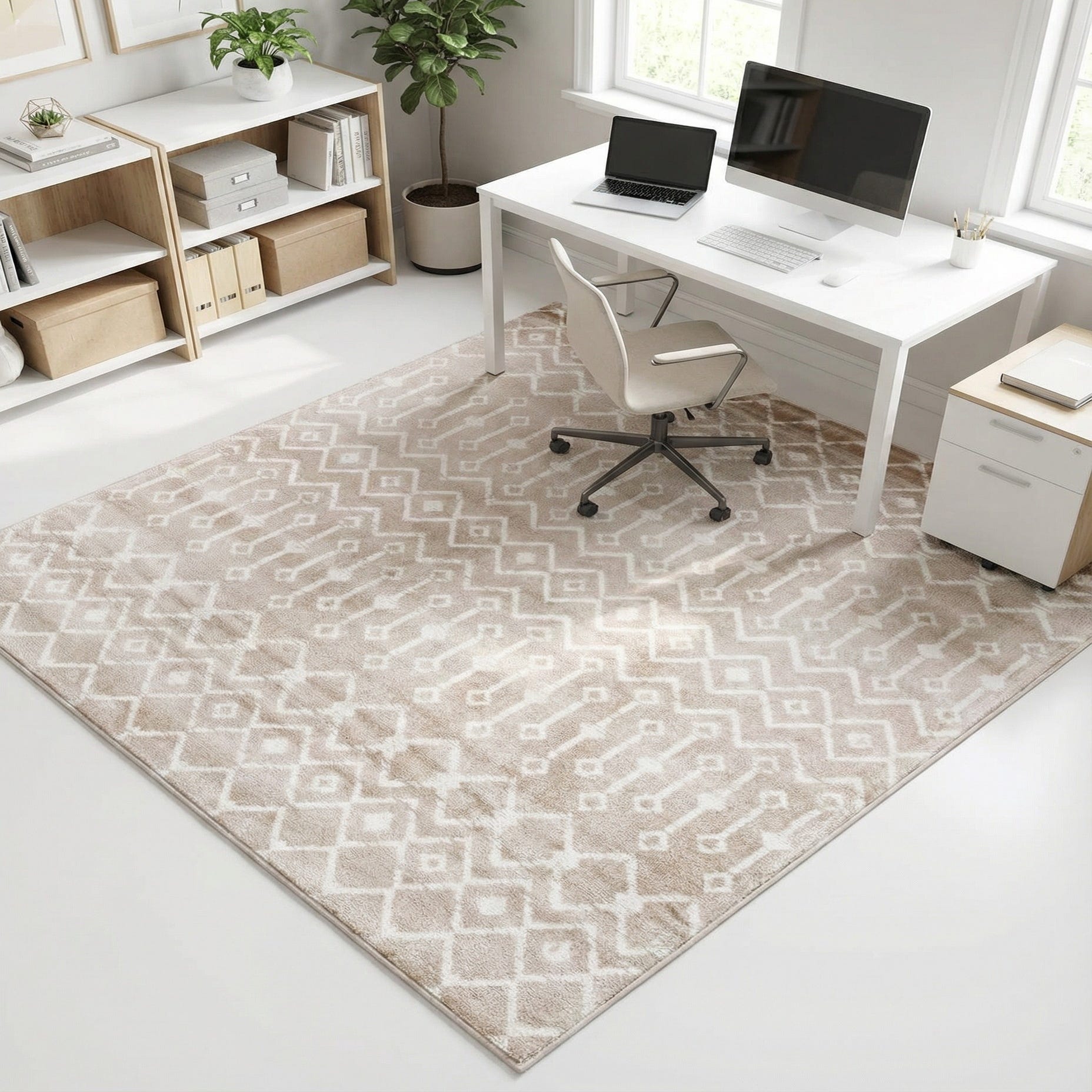 This rug works well as an anchoring layer in a relaxed living room beneath a coffee table, as a grounding piece in a bedroom underfoot at the foot of the bed, or as a neutral backdrop in a coastal, modern farmhouse, Scandinavian, or transitional scheme. Pair it with warm wood tones, ivory linens, and simple metal or rattan accents to let the pattern add interest without overwhelming the room.