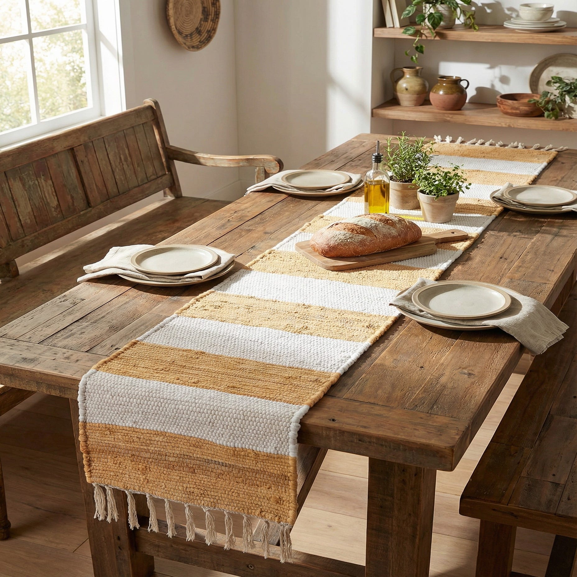 This runner pairs naturally with light wood or rattan furniture and a neutral decor palette — think casual dining tables, entryway consoles, or a kitchen island laid out for everyday meals. It complements coastal, modern farmhouse, Scandinavian, or relaxed boho interiors, and layers well with ceramic dinnerware, woven placemats, and linen textiles to create a warm, grounded table setting.