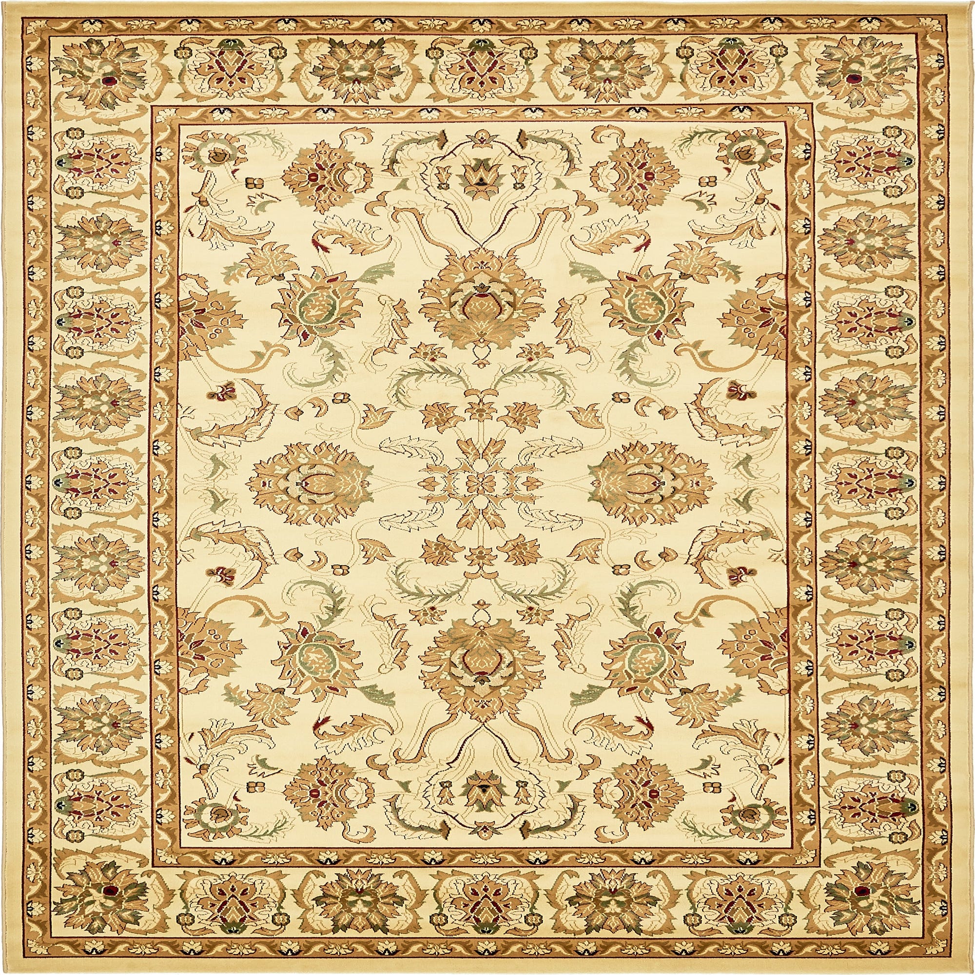 Primary color is Beige. Colors in this rug include: Beige, Blue, Green, Red, Tan, Brown.