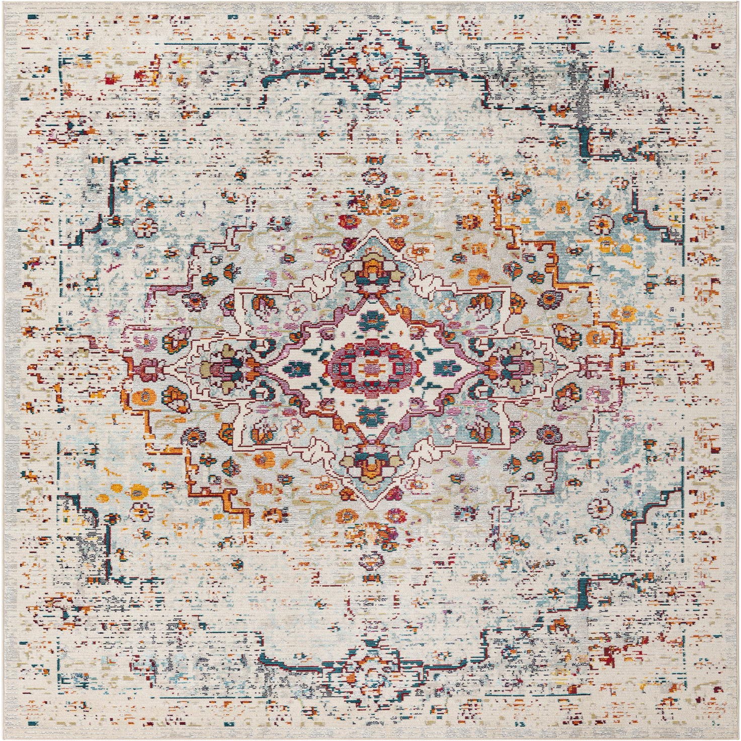 Primary color is Beige. Colors in this rug include: Beige, Blue, Burgundy, Cream, Navy Blue, Red, Orange, Yellow.
