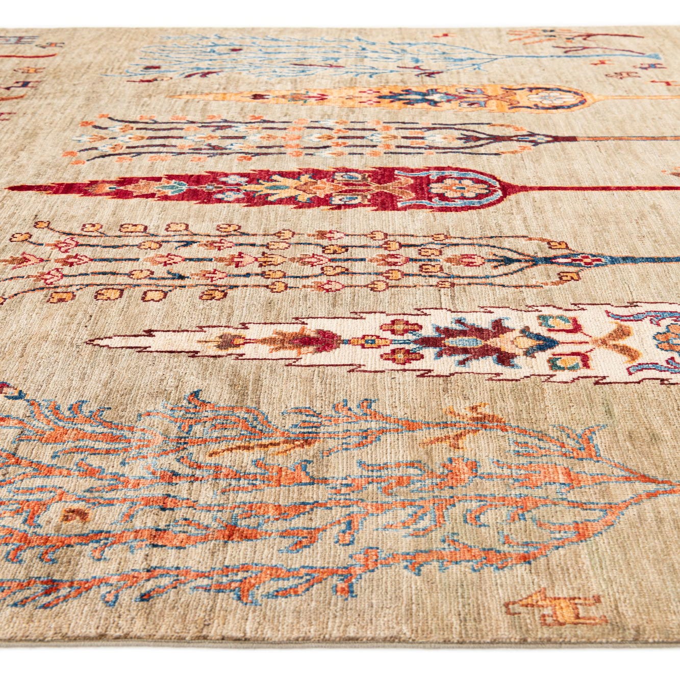 A 6x9 rectangular wool rug with a tan background featuring a whimsical modern floral pattern of colorful trees and small animals.