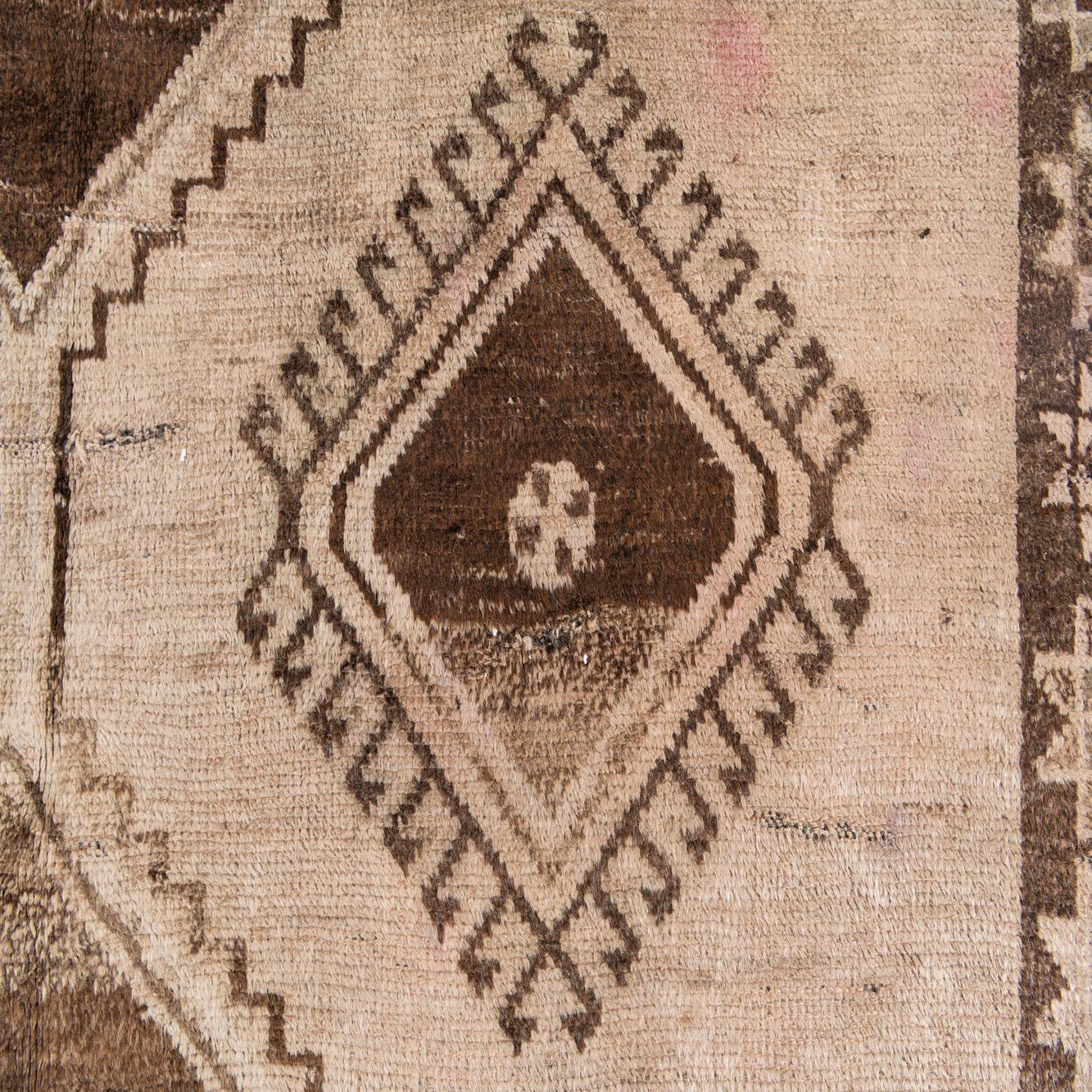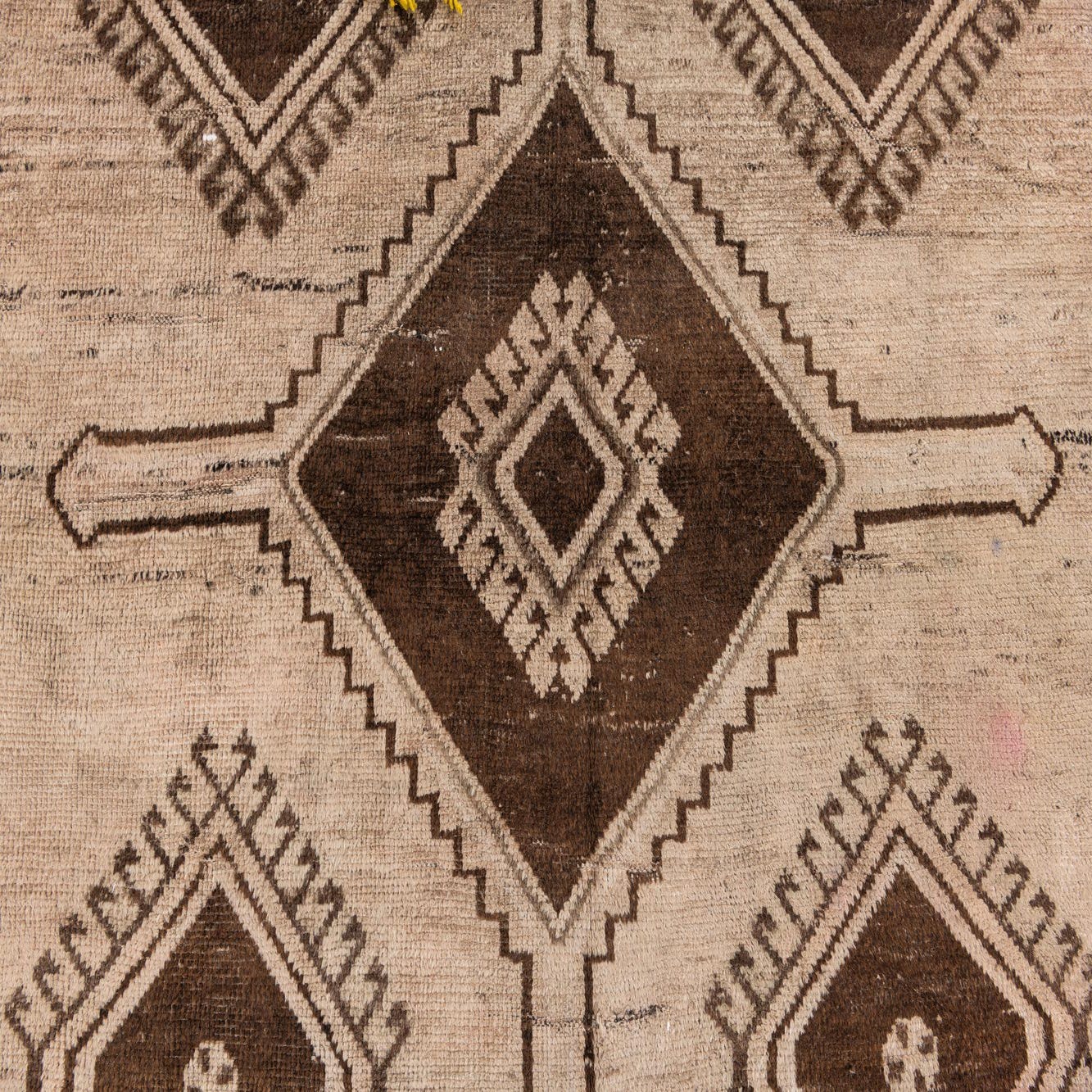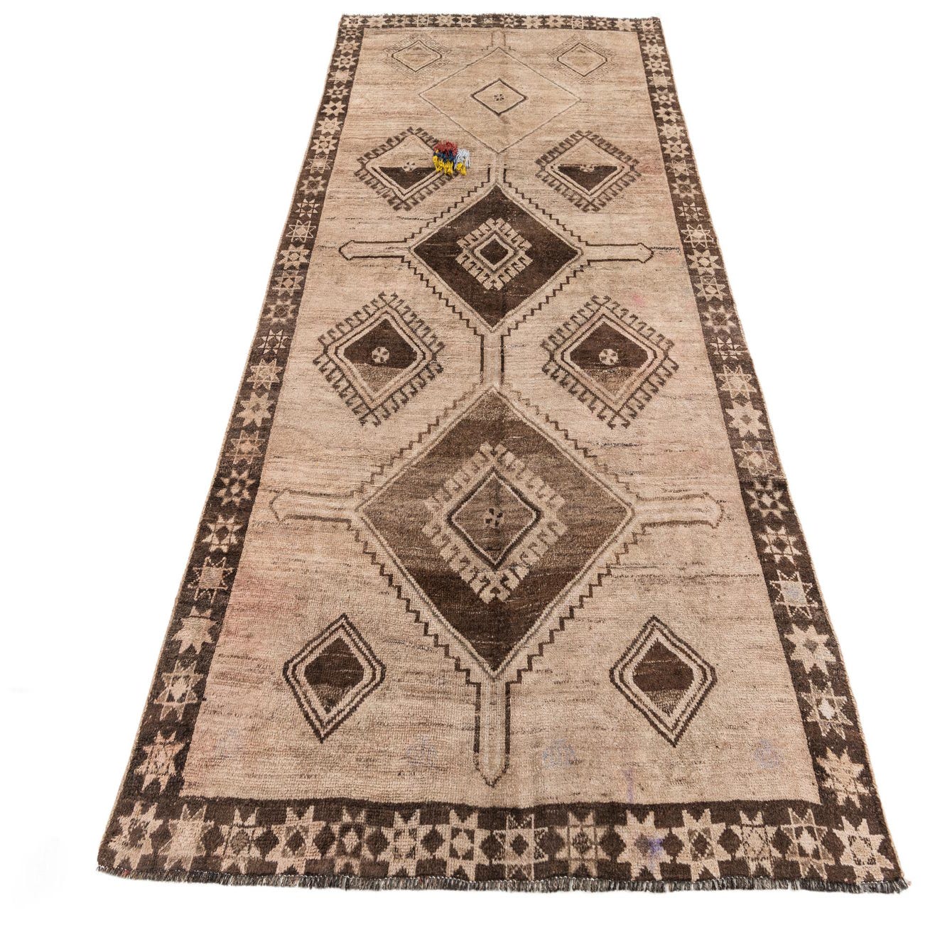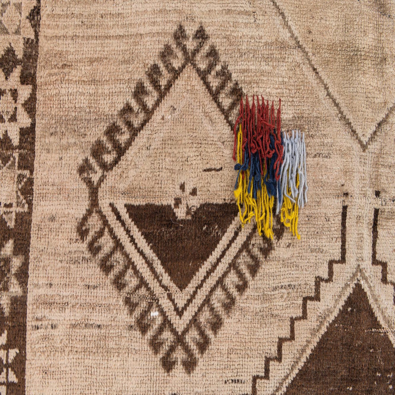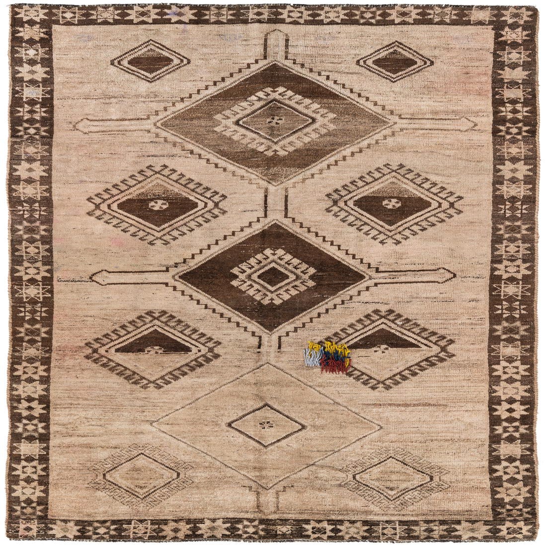 A 6x9 rectangular Balouch tribal wool rug in browns and tans with a central medallion and geometric patterns, ideal for a living room.