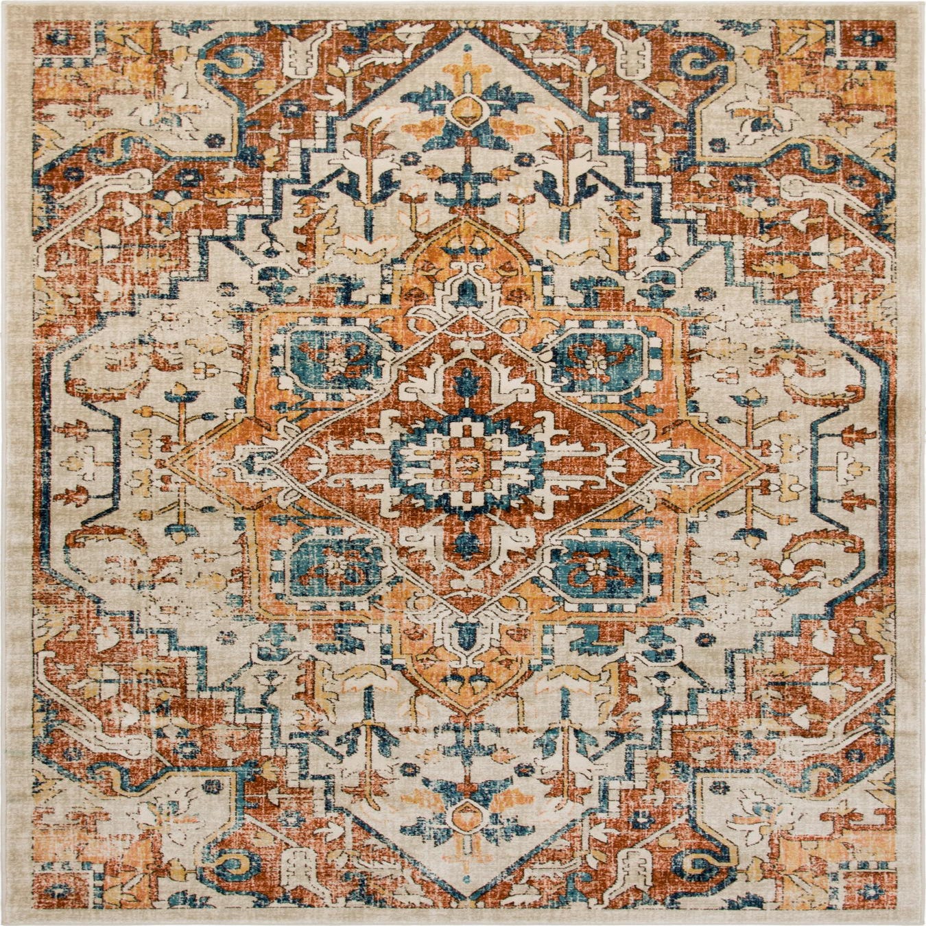 Primary color is Beige. Colors in this rug include: Beige, Blue, Brown, Navy Blue, Orange, Red, Yellow.