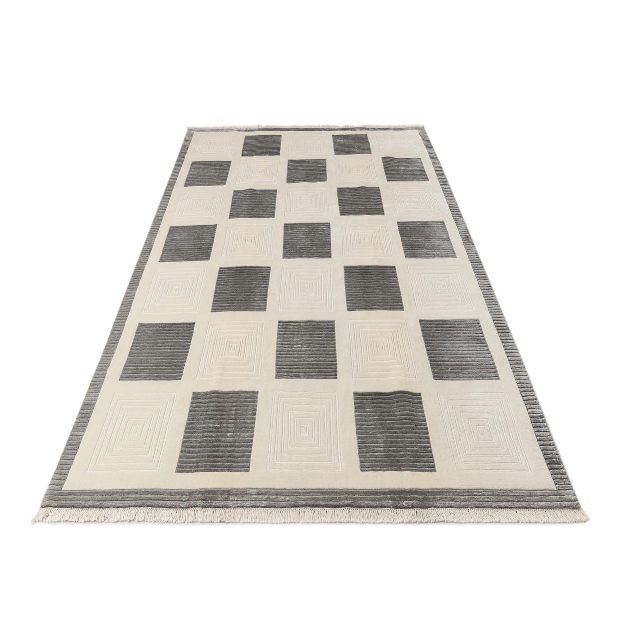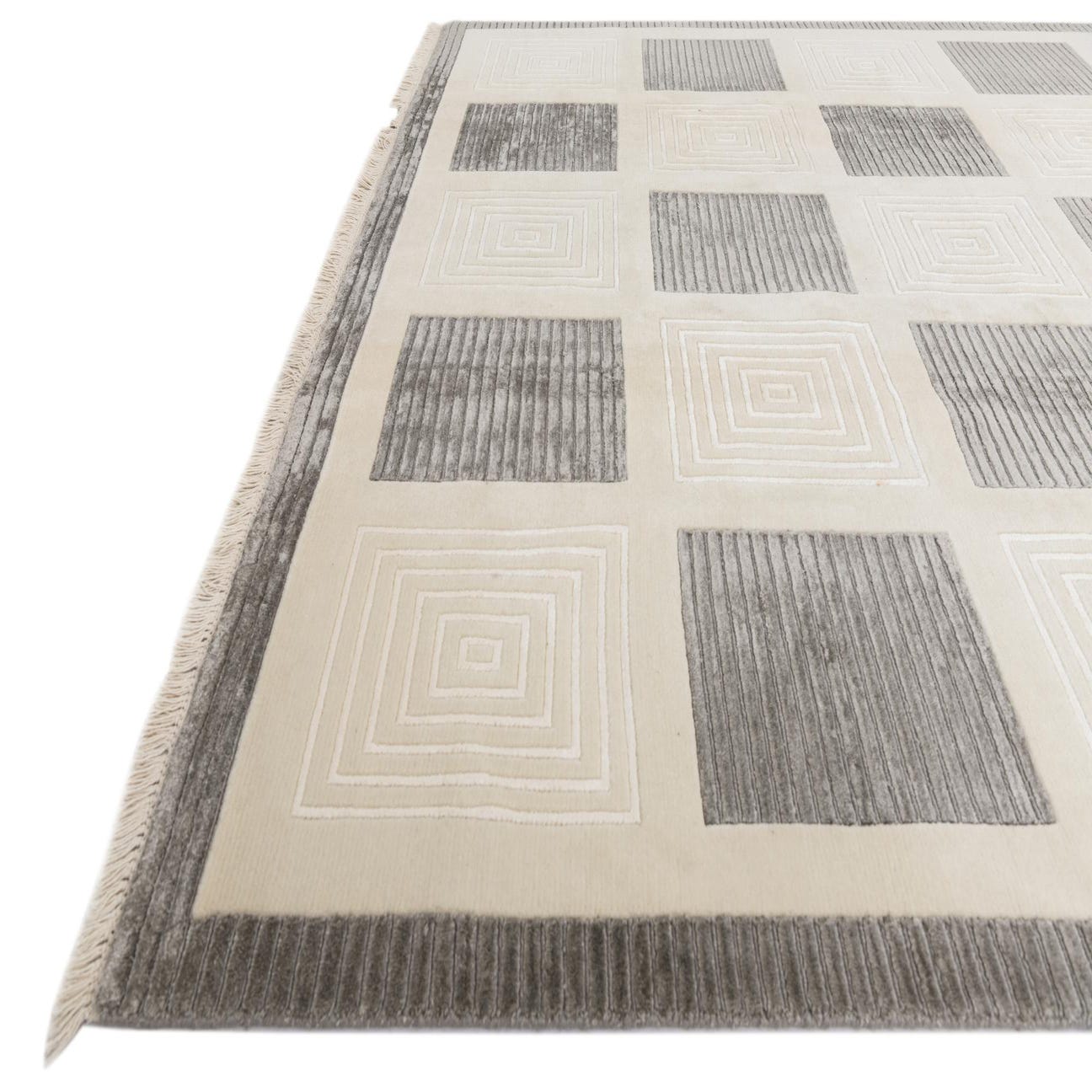 The Darya collection presents a 6x9 hand-knotted rug crafted from 100% wool, offering a luxurious and durable addition to any space. This particular piece features a pattern of alternating square frames with concentric square patterns throughout, creating an appealing geometric design. The color palette is comprised of neutral beige, gray, and ivory tones, with beige serving as the dominant background hue, adding warmth and versatility to its aesthetic appeal. Its texture is rendered with a combination of dense weaves and plush pile, providing both visual depth and a tactile experience.
