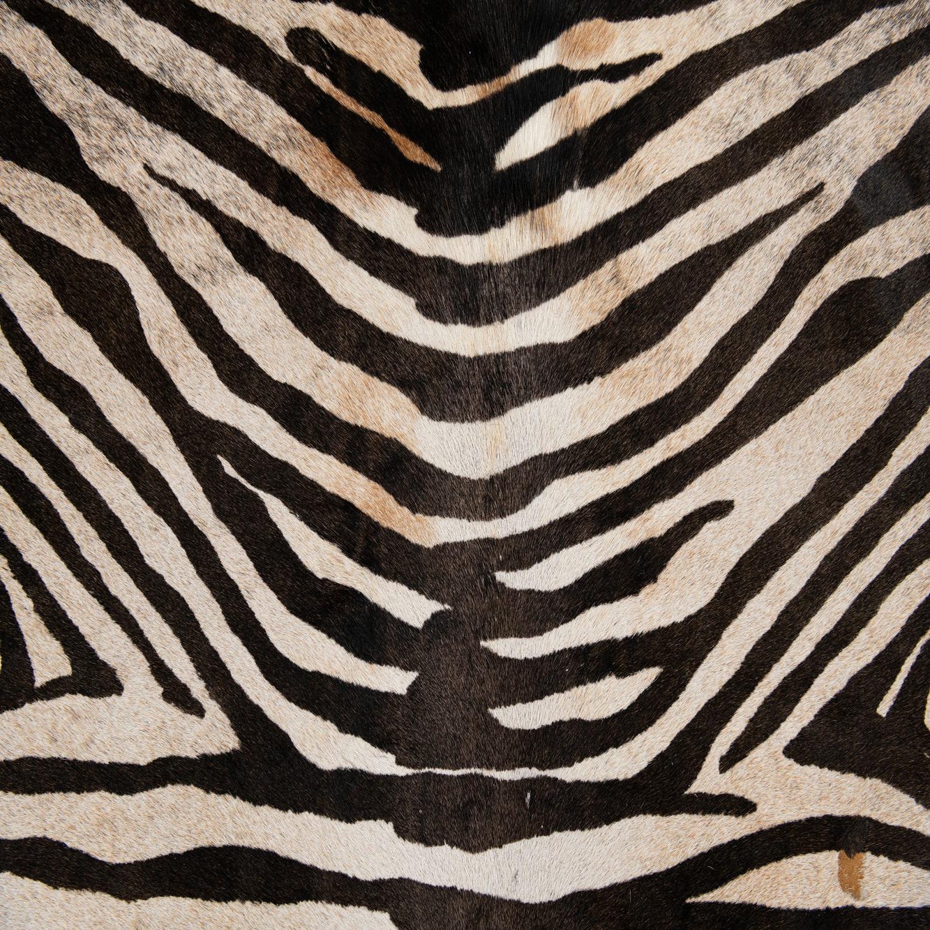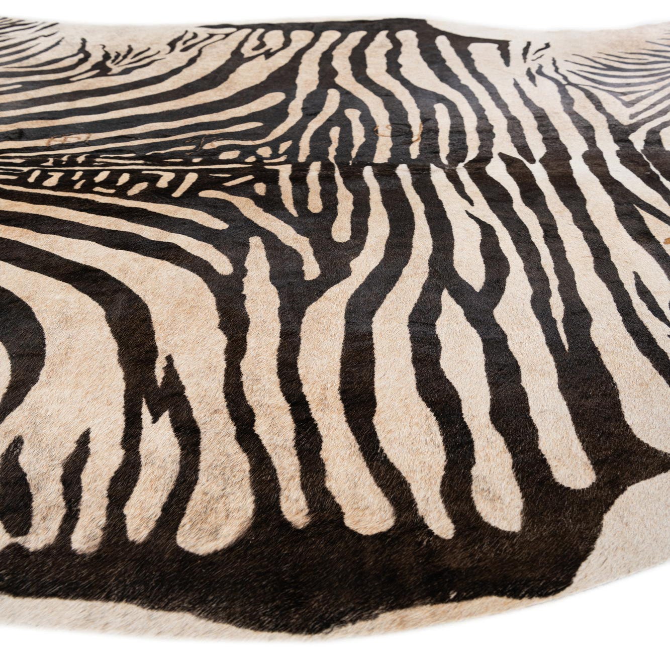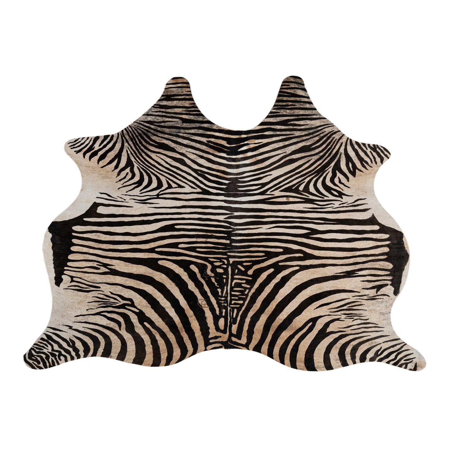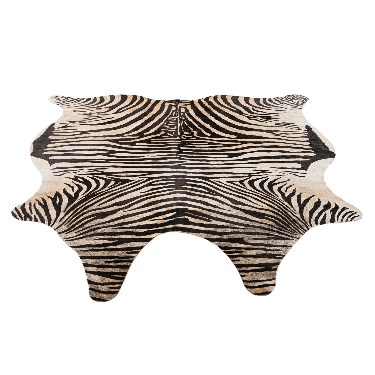 A freeform zebra print cowhide rug with black stripes on an ivory and tan background, showcasing its natural shape.