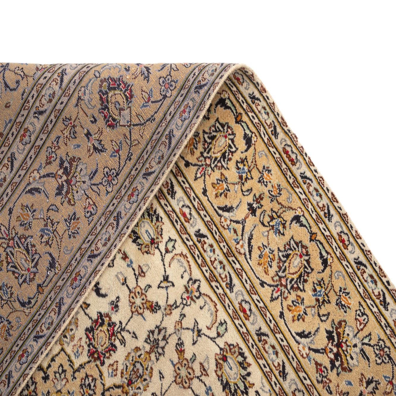 This hand-made Kashan rug embodies the traditional elegance with its meticulously crafted pattern and rich color palette. The predominant beige background is harmoniously paired with intricately detailed motifs in cream, dark blue, yellow, brown, grey, and blue hues. The design features a central medallion surrounded by florals and vine scrolls, a common motif that echoes the sophistication of Persian artistry.