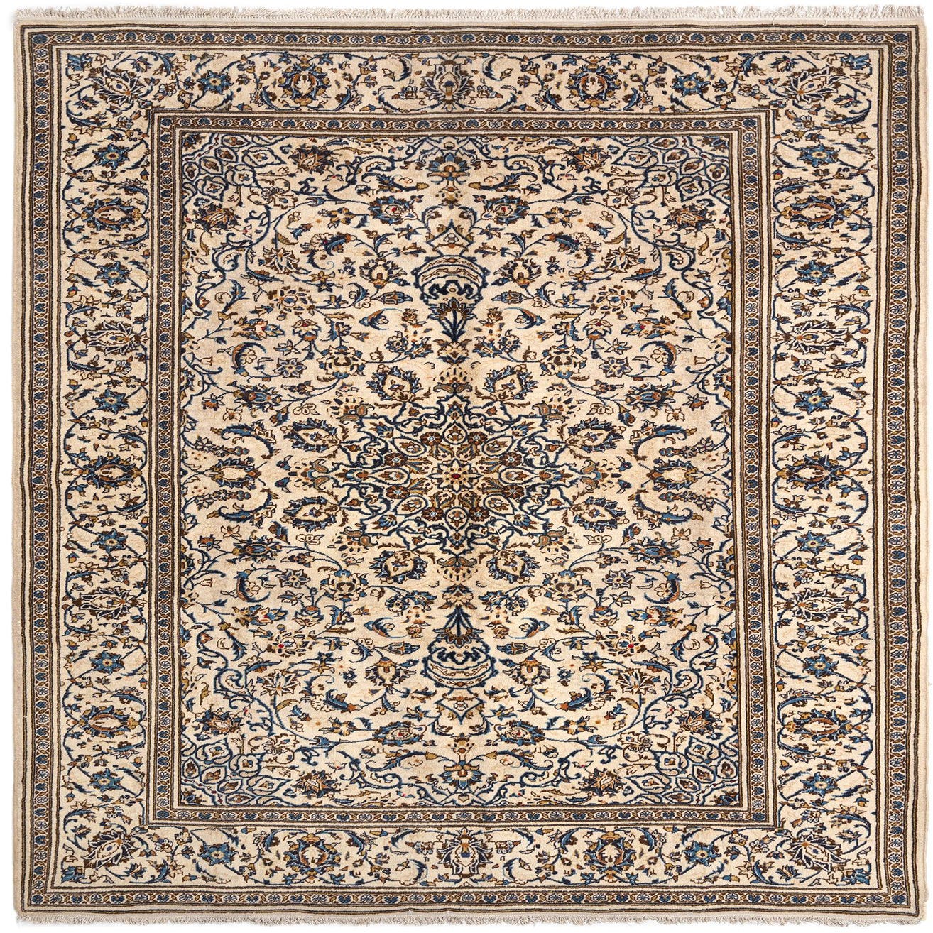 A 6x9 rectangular Kashan Persian wool rug featuring an ivory and cream background with intricate brown and blue floral patterns, ideal for a living room.