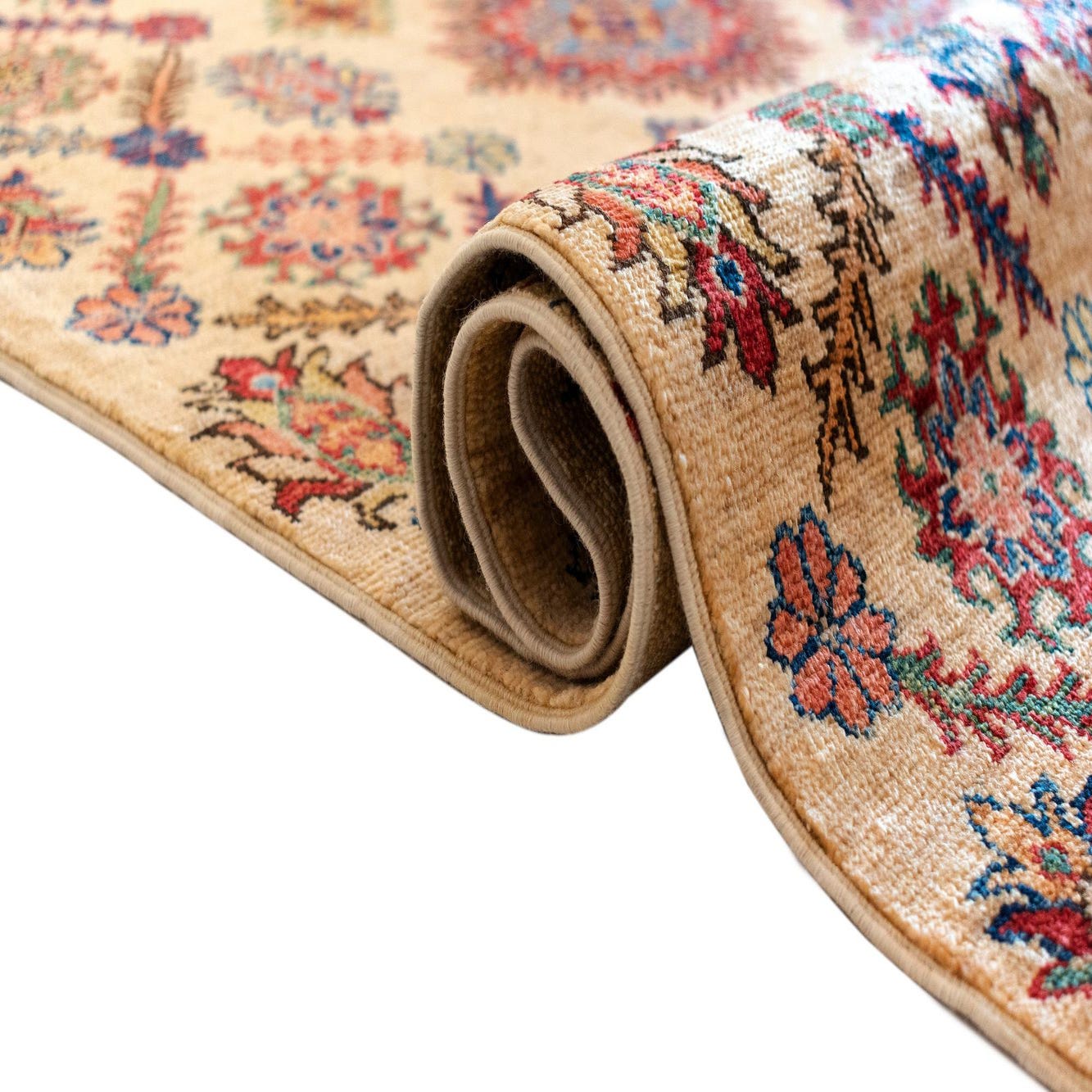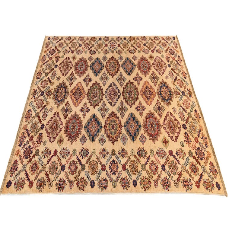 This Kazak collection rug presents a geometric array of motifs in a rich palette that includes warm hues such as reds, blues, greens, and oranges, accentuated by a versatile beige background. The 6x9 hand-made piece is crafted from 100% wool, lending it a soft and durable texture suited for various living spaces.