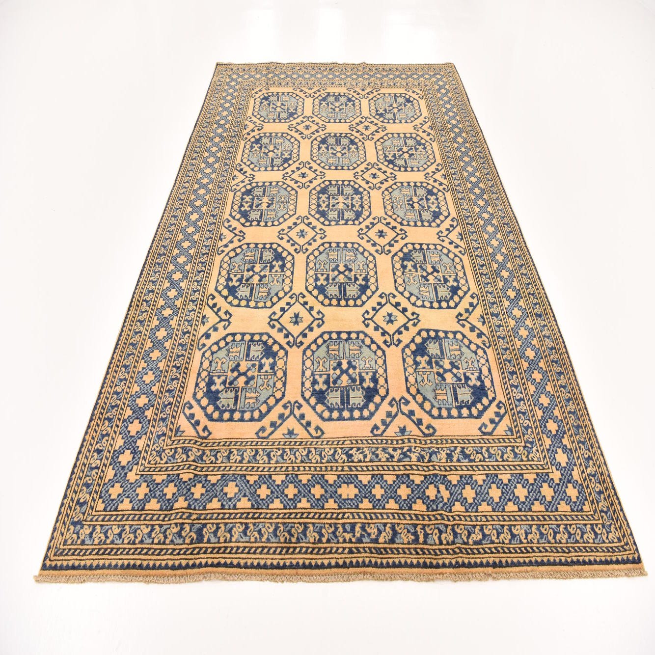 A rectangular 6x9 Kazak rug in tan and blue, featuring traditional Southwestern tribal patterns with geometric medallions and a detailed border.