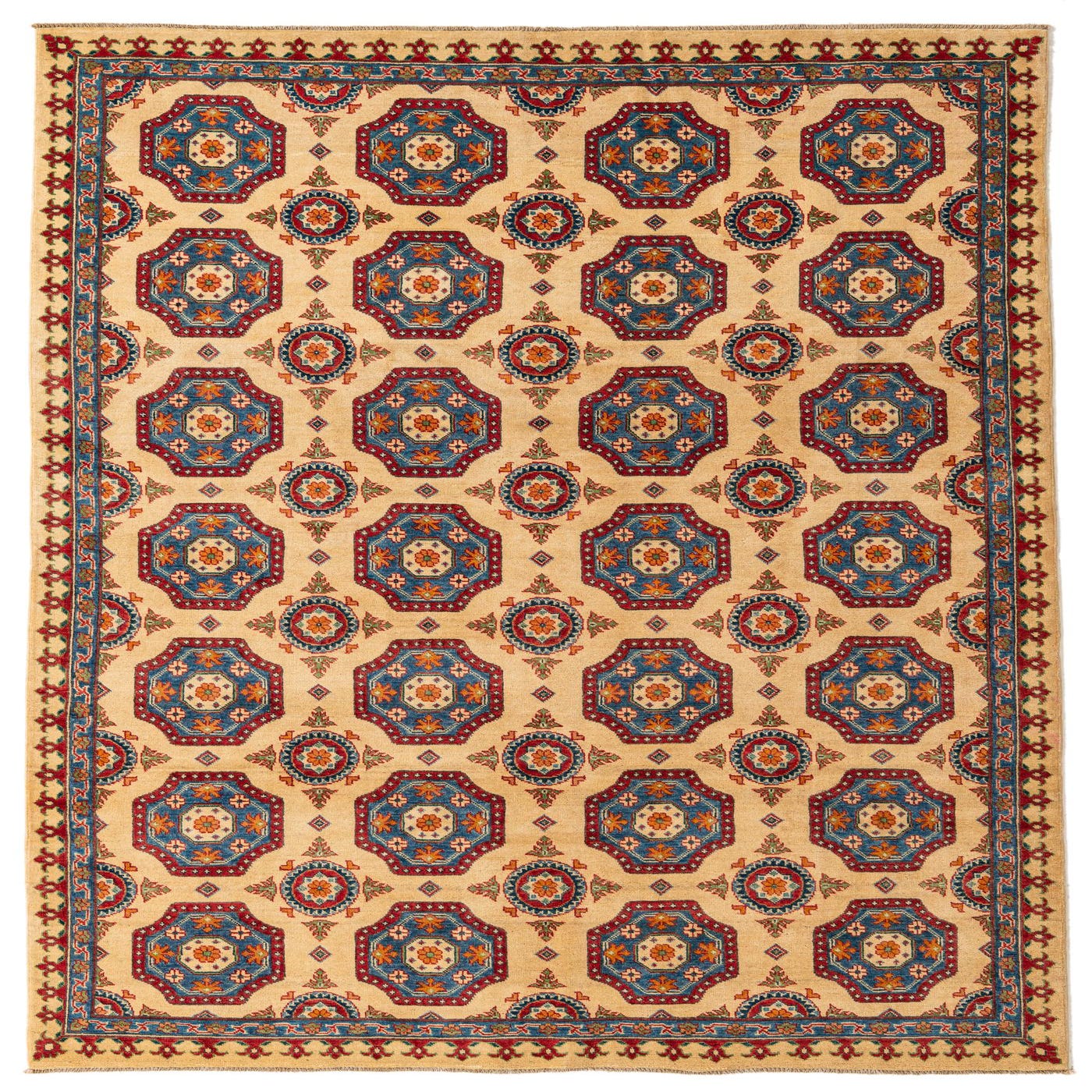 The Kazak collection rug is a hand-knotted piece crafted from 100% hand-spun wool, sized at 6x9 feet, offering both durability and a soft, plush texture underfoot. The rug showcases a symmetrical geometric pattern, harking back to traditional designs. Each medallion is outlined in rich navy blue and is filled with accents of blue, brown, red, yellow, and navy blue on a warm beige background that exudes a sense of warmth and sophistication. The perimeter of the rug is framed by a detailed border featuring complementary colors that tie the design elements together harmoniously.