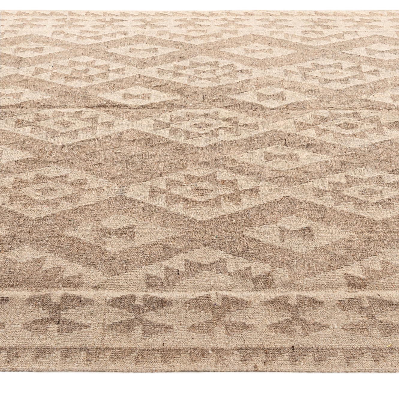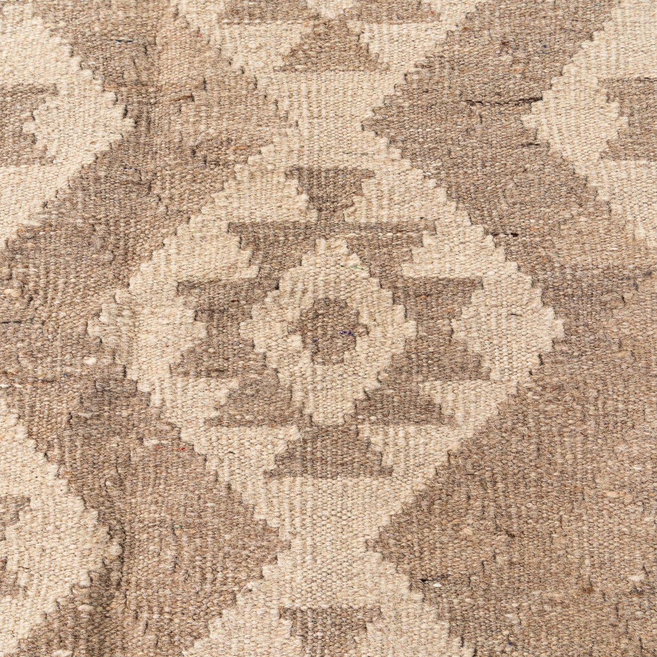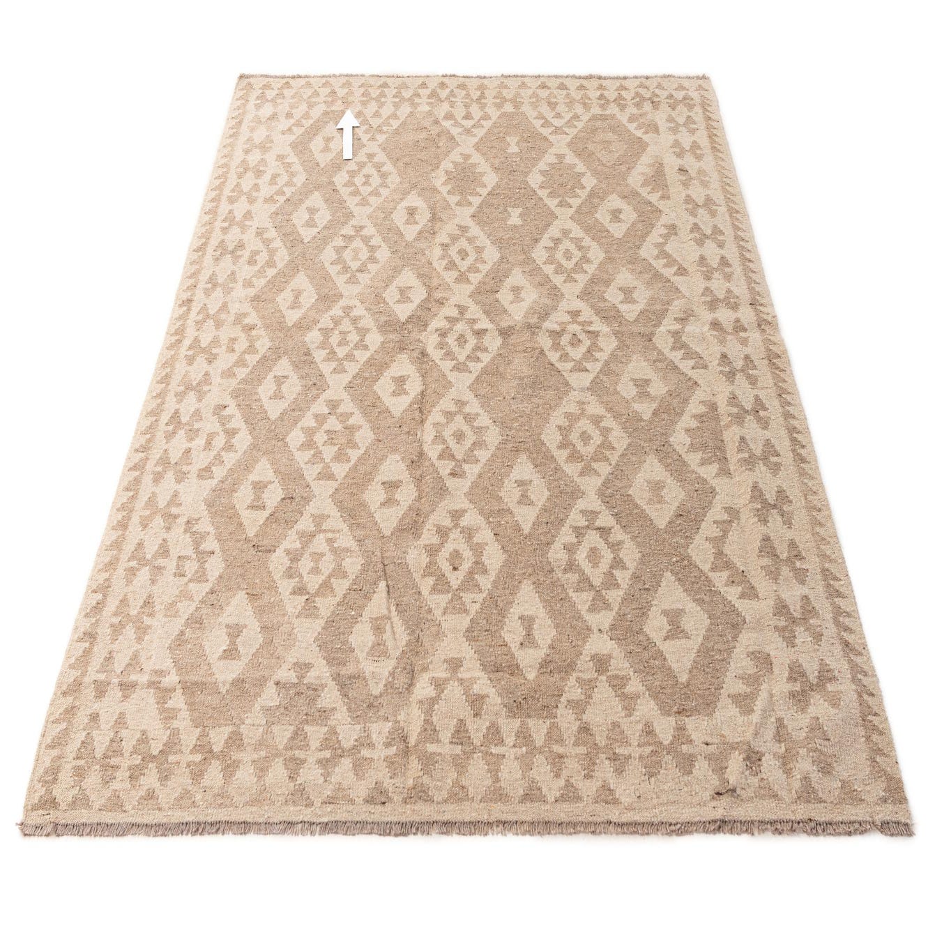 A 6x9 rectangular Kilim Maymana rug featuring a tribal geometric diamond pattern in shades of brown and cream.