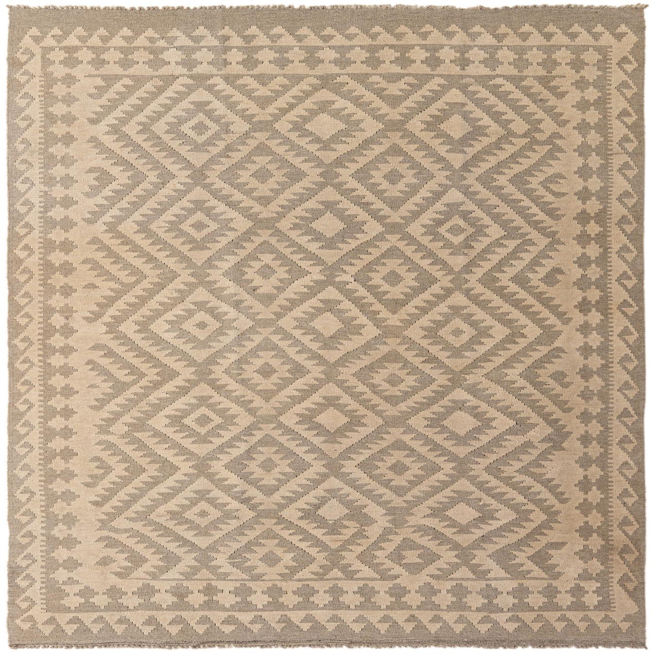 A rectangular 6x9 Kilim Maymana rug featuring a tribal geometric pattern in brown and cream tones.