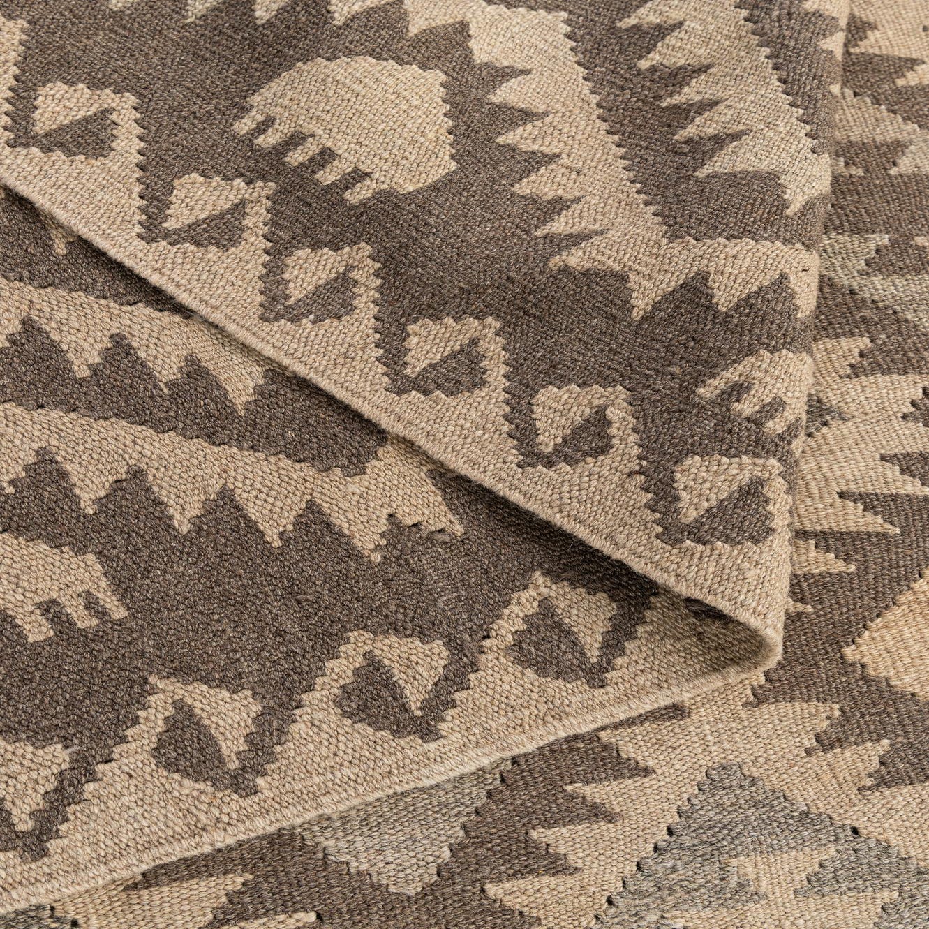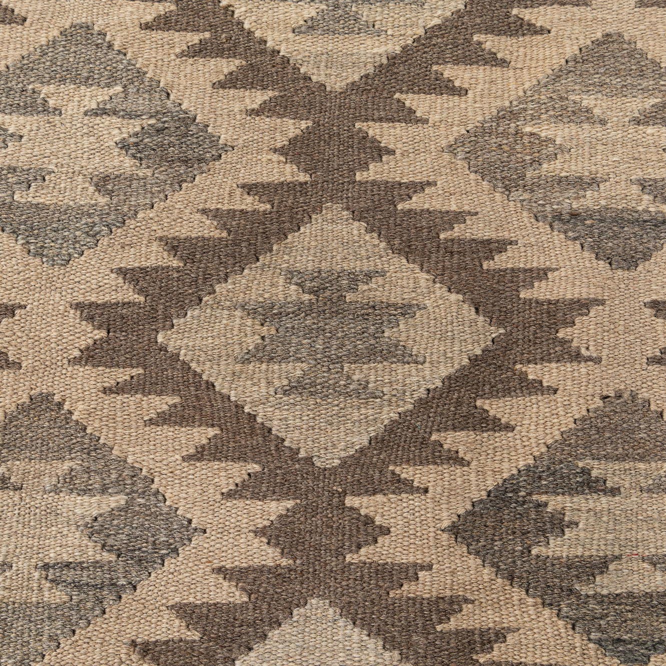 A 6x9 rectangular Kilim Maymana rug featuring a tribal geometric pattern in shades of brown, tan, and ivory.