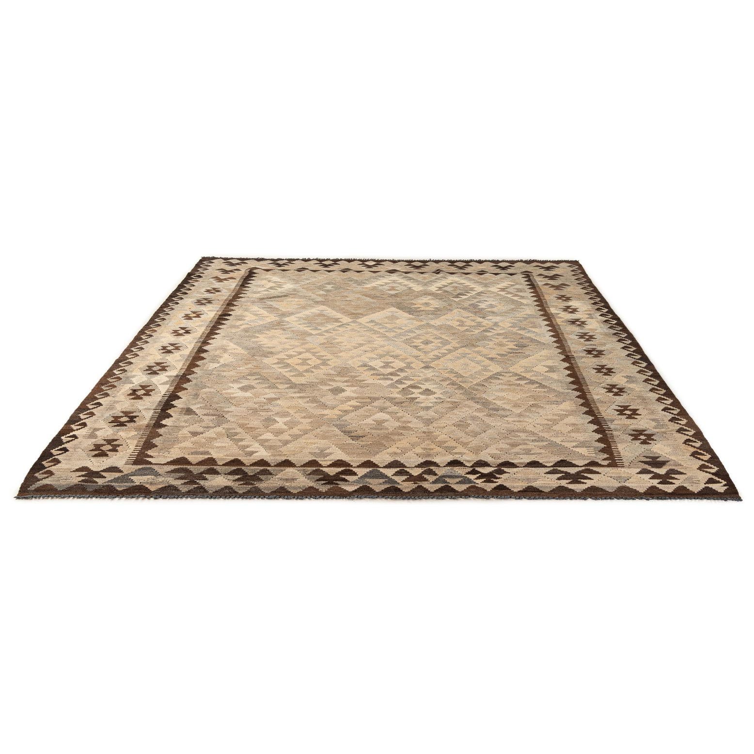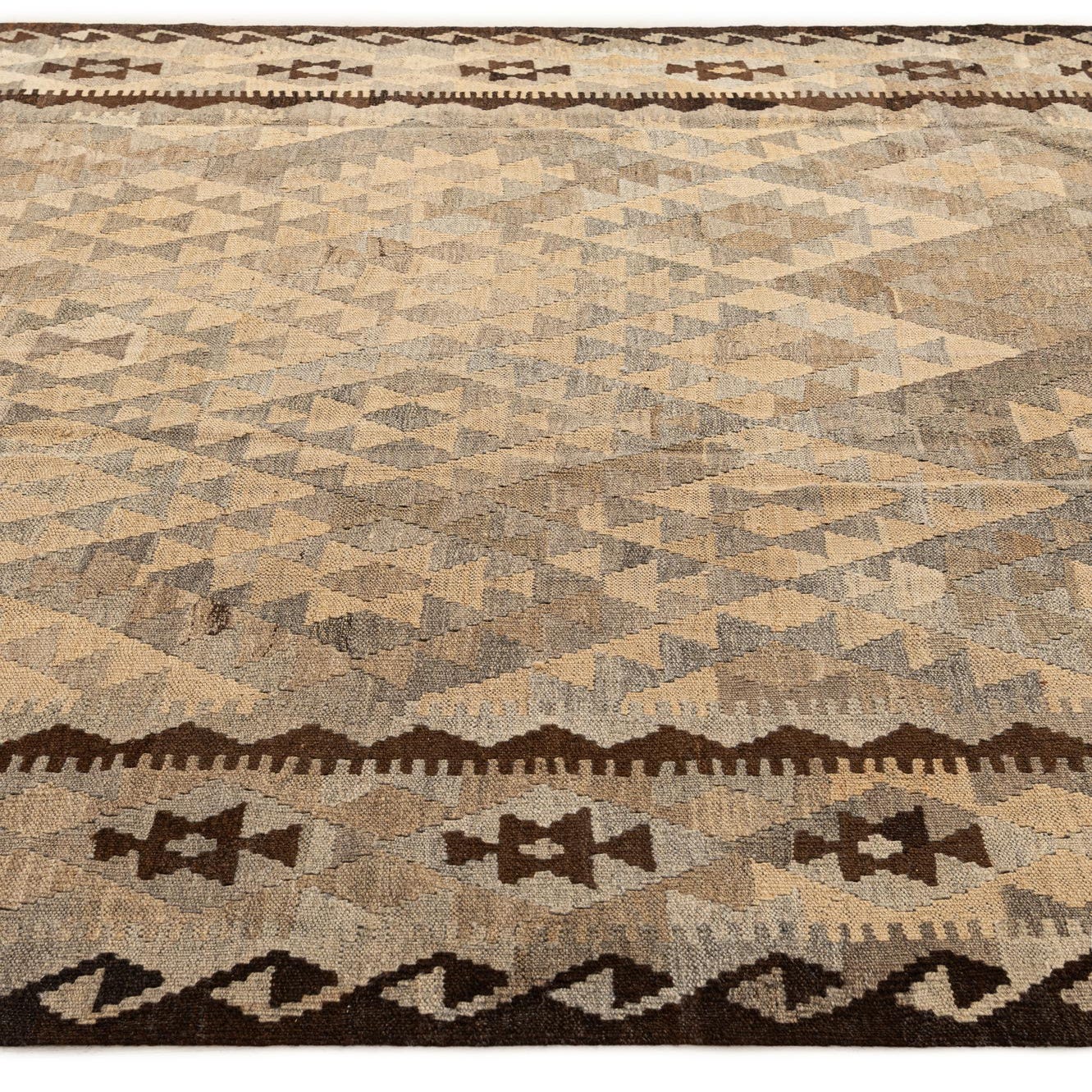 A 6x9 rectangular Kilim Maymana rug featuring a tribal geometric pattern in shades of brown, tan, and cream.