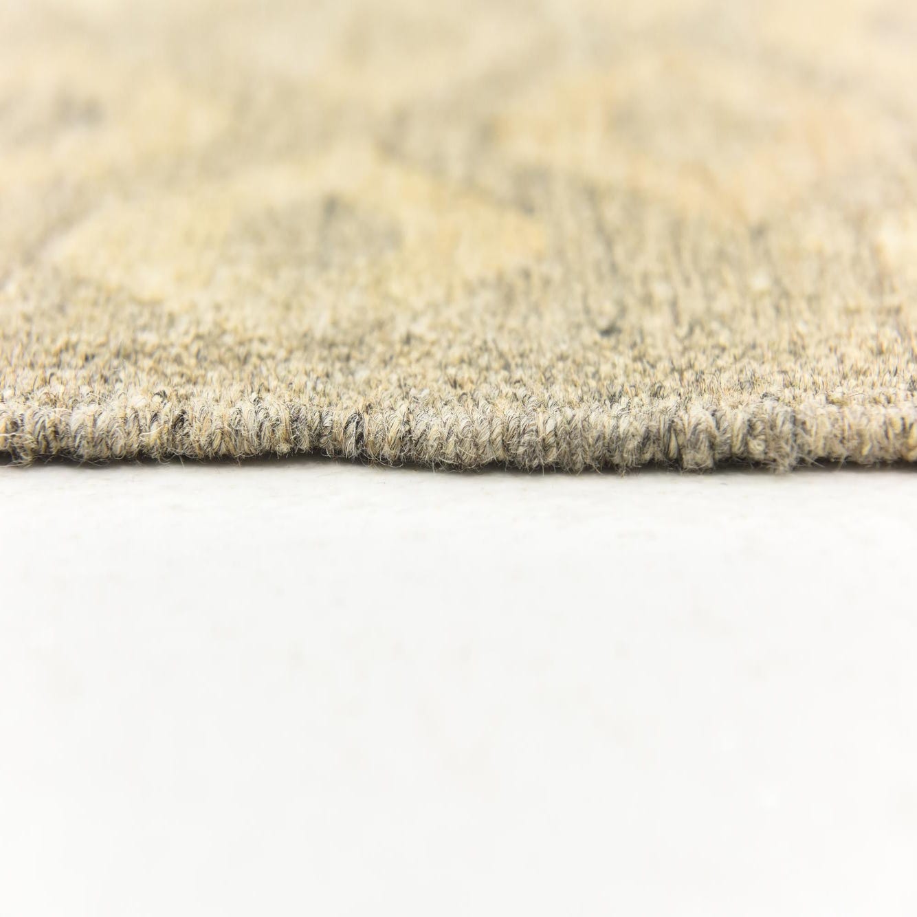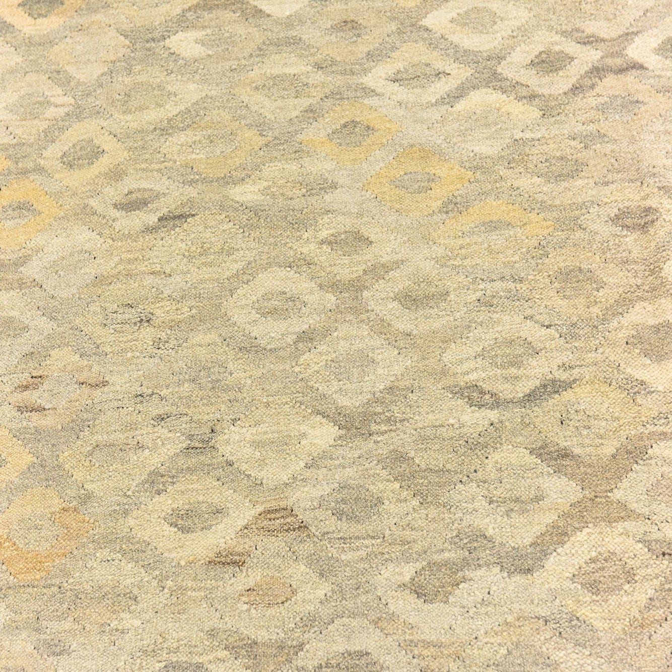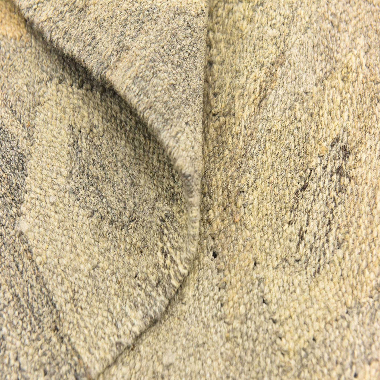 With its neutral color scheme and modern kilim design, this rug can seamlessly integrate into a variety of interior decor scenarios, from minimalistic and modern to rustic and bohemian. It would serve well as a foundational piece in a living room, under a dining table, or in a spacious hallway. The subdued hues provide a solid base for interior designers to layer different textures and colors within a room, offering an adaptable backdrop for a range of furniture styles.