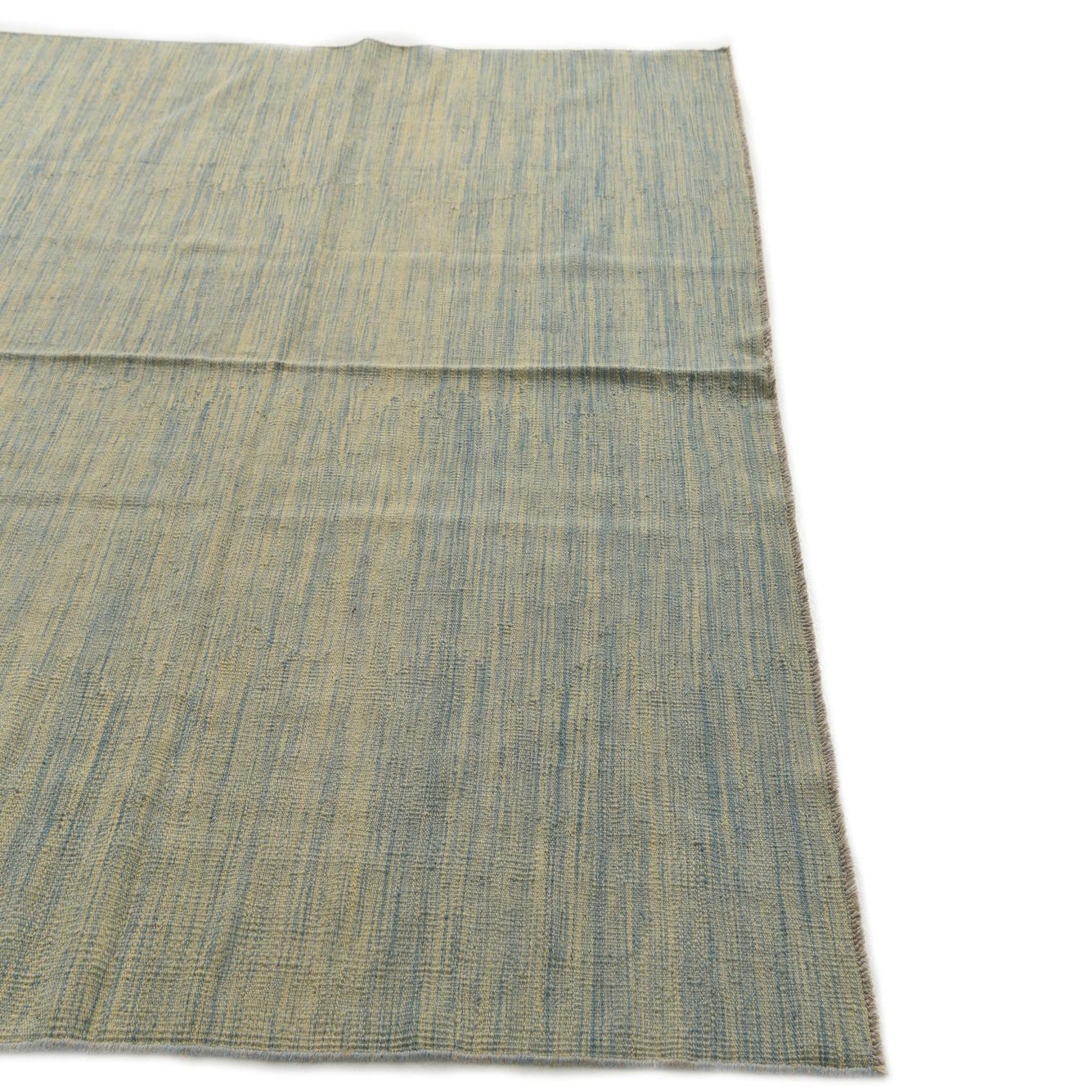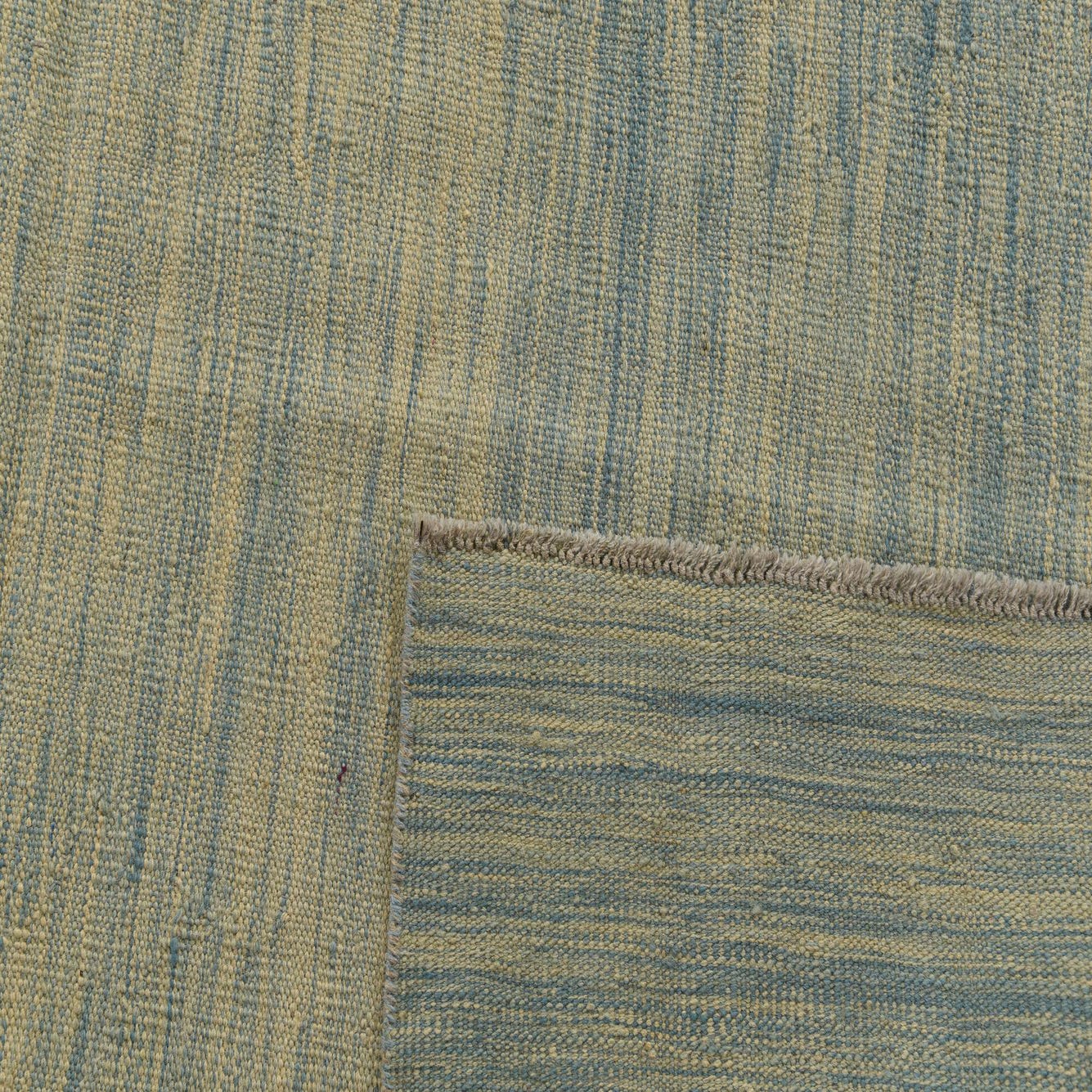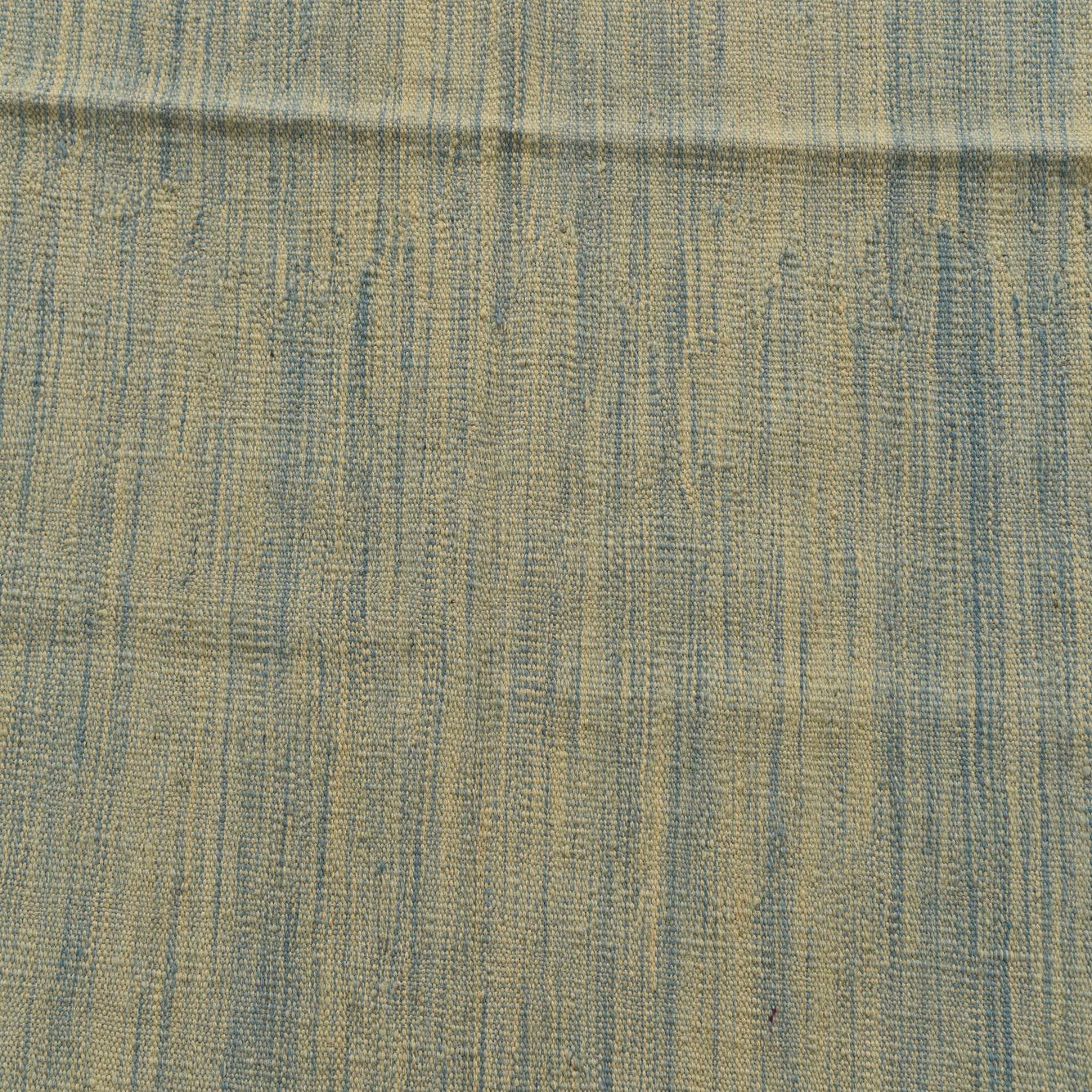 Hand-woven from 100% wool, this flatweave rug combines a warm beige ground with soft blue striations that run horizontally across the field. The pattern is minimal and linear, with subtle variations in tone where the blue yarns mingle with the beige for a gently striated effect. The weave is low-profile and tactile — running your hand across the surface reveals a firm, slightly textured wool that lays flat while still offering a warm, natural feel underfoot.