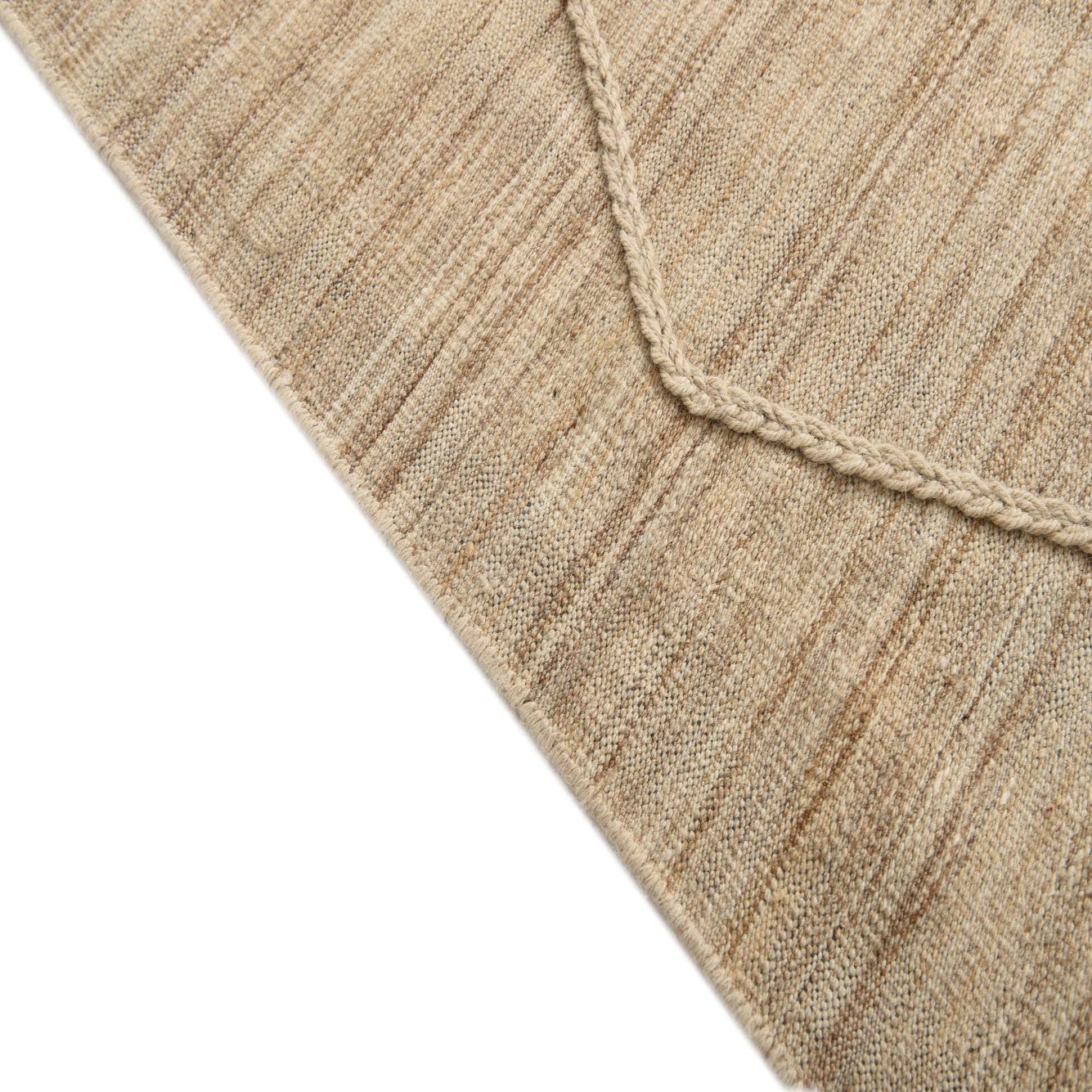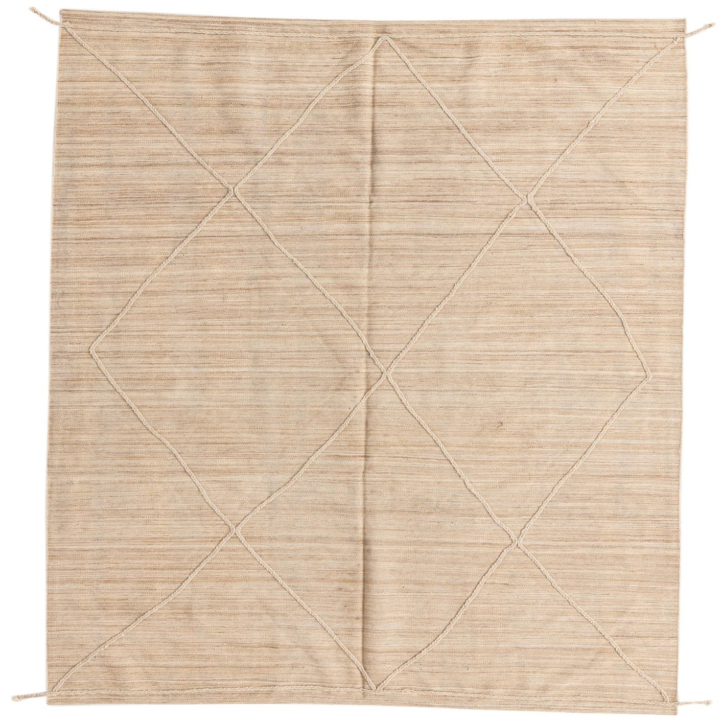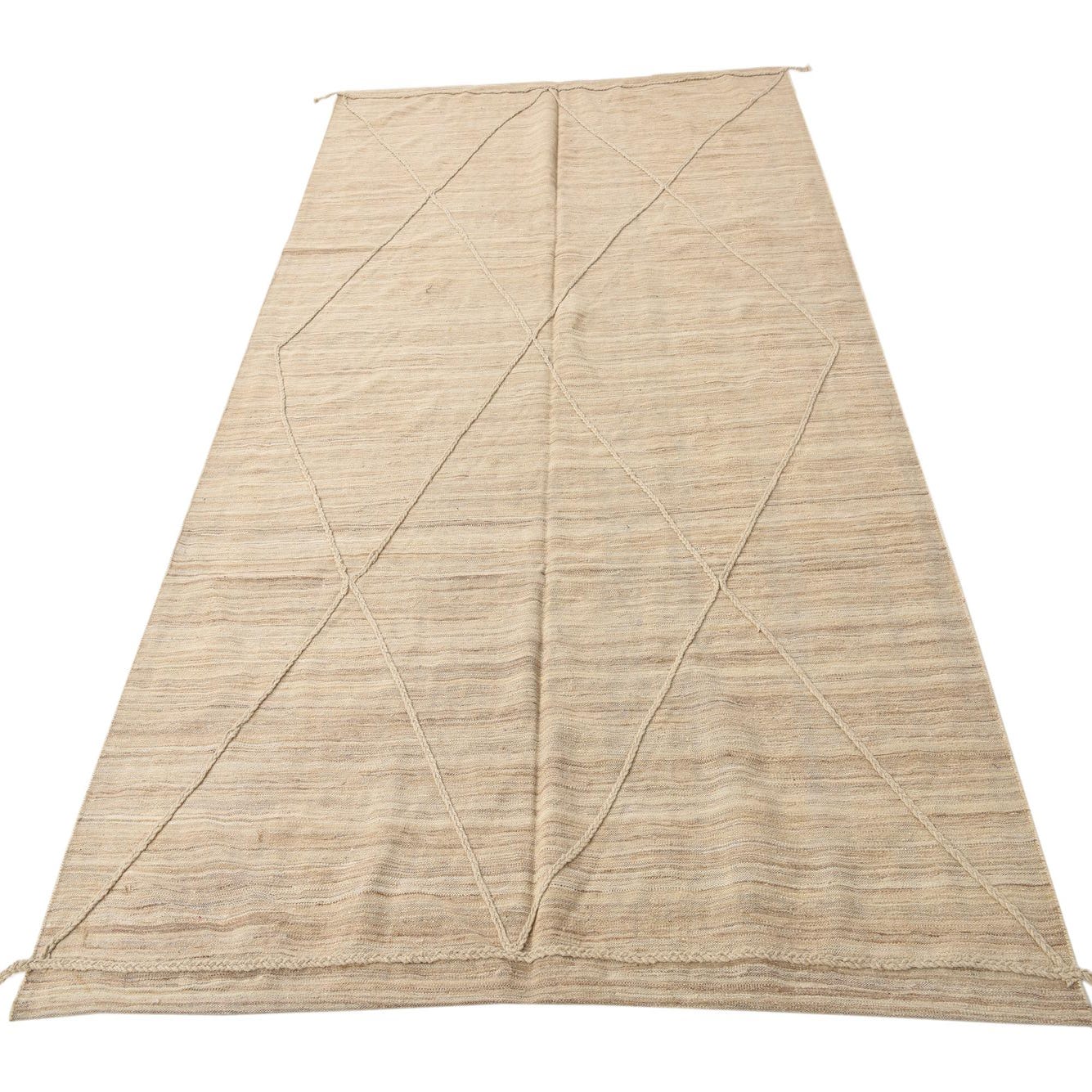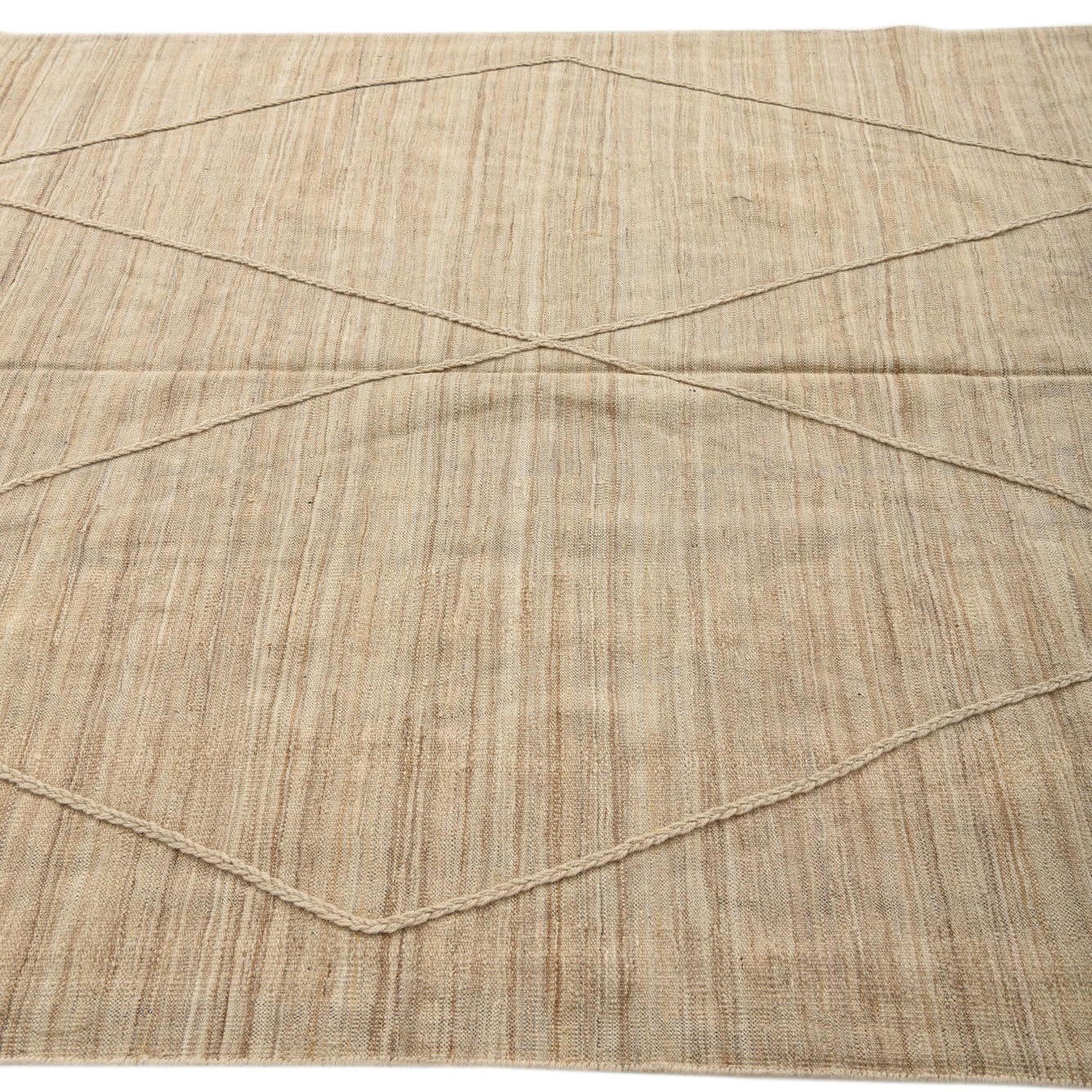 A 6x9 rectangular Kilim Modern wool rug in natural brown and cream tones with a subtle tribal diamond pattern, ideal for a living room.
