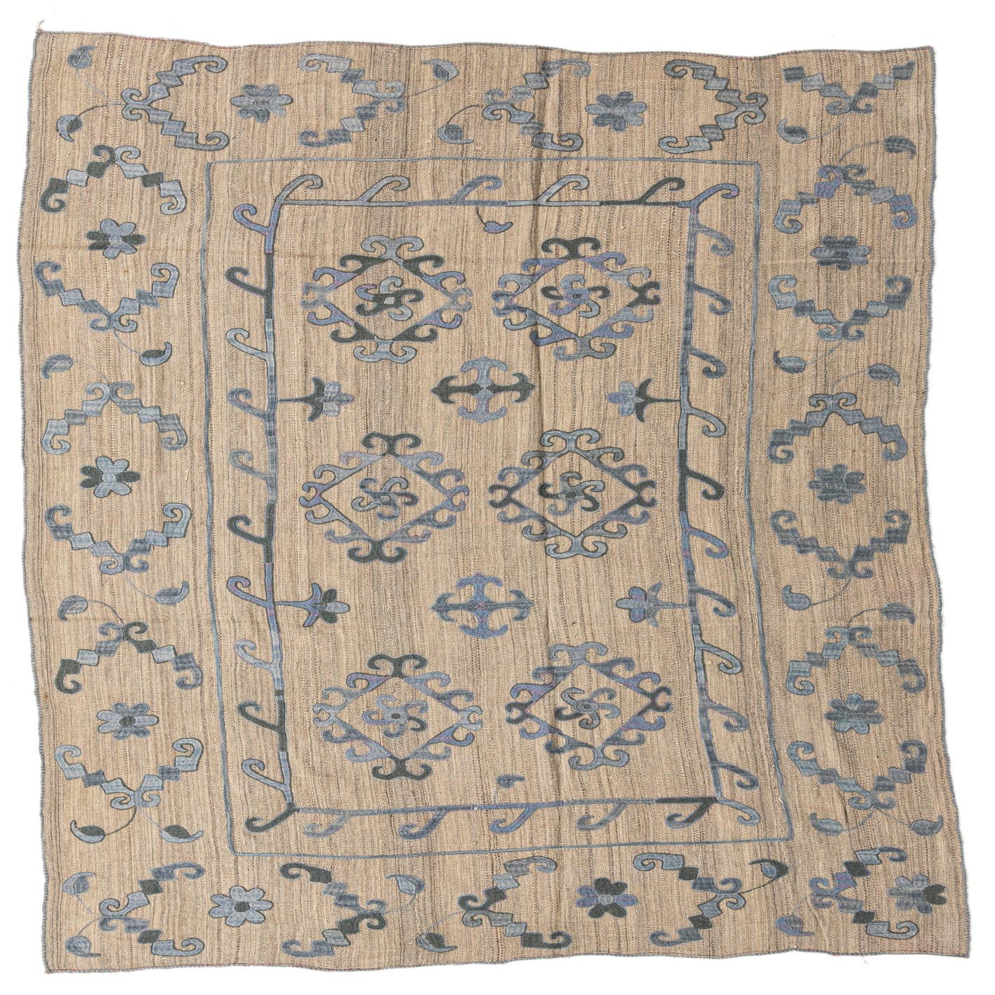 Primary color is Beige. Colors in this rug include: Beige, Blue, Gray.
