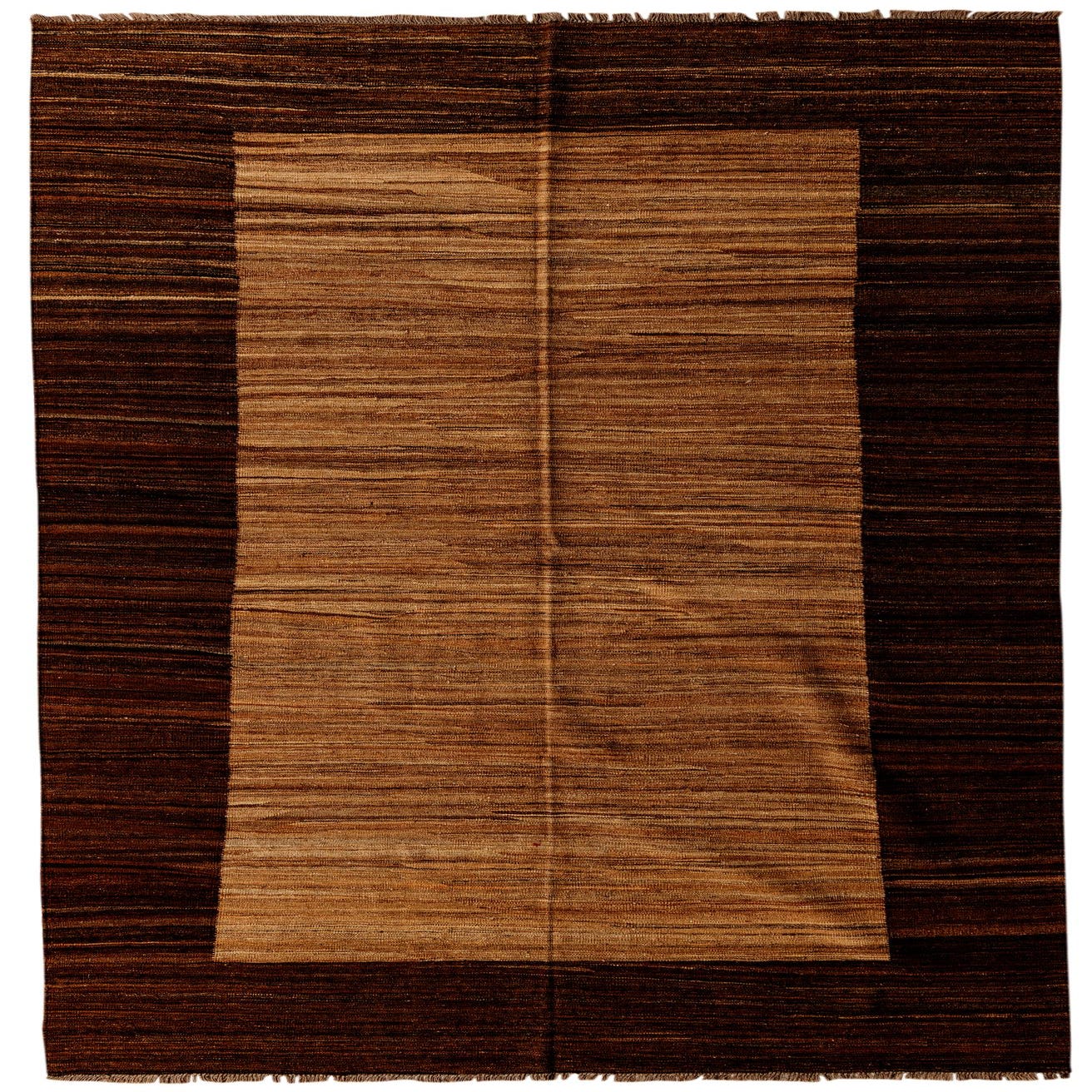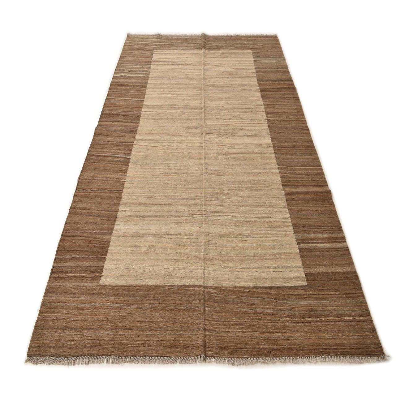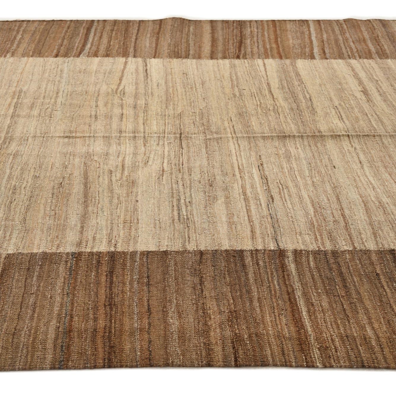 A 6x9 rectangular Kilim Modern rug with a flatweave, featuring a dark brown border and a lighter tan center.